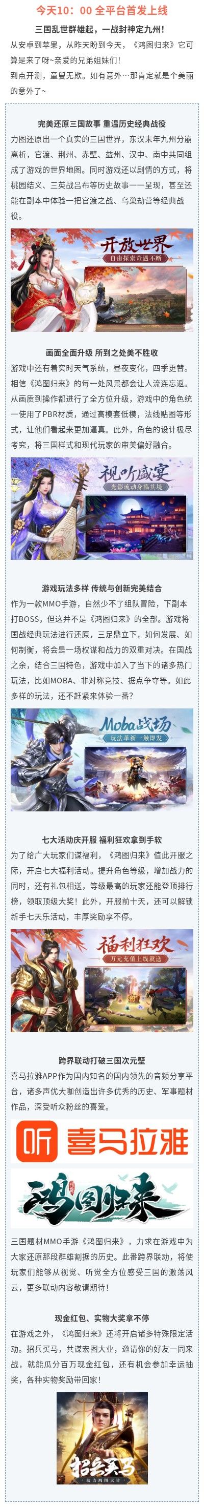 三国乱世群雄起 一战封神定九州全新三国题材国战MMO手游《鸿图归来》今日如约开启预下载了!!开疆拓土一统九州,封候拜将执掌一方!《鸿图归来》力图还原一个真实的三国世界,升级版的画面品质,多元化的玩法,必将给你带来不一样的游戏体验。为了庆祝游戏上线,我们也为大家准备了多种福利,来提前预习,让你开服快人一步~PS:最终以游戏内上线活动为准活动一:首充送豪礼,初恋的惊喜活动时间:永久有效活动