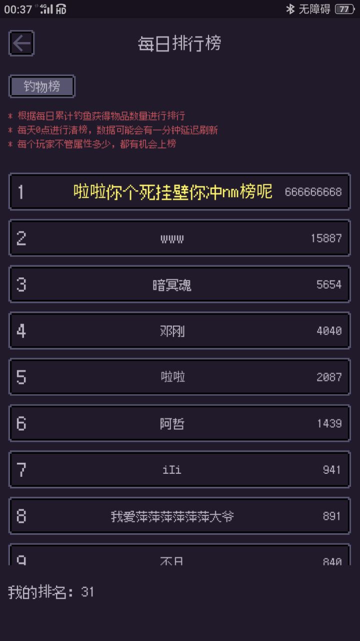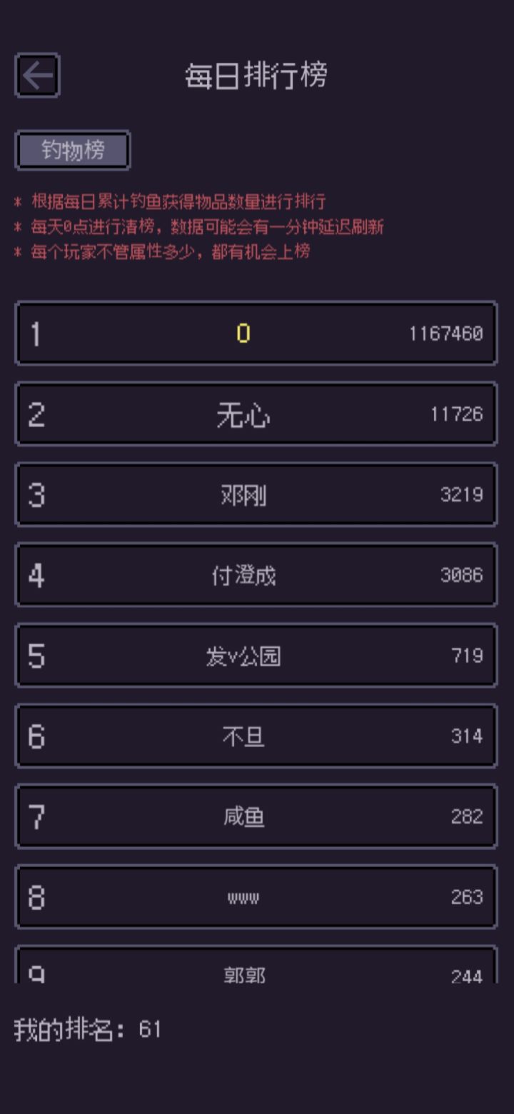 之前发了个昨天的游玩经历,这回发今天的,一个小更新后出了一个不知道是不是BUG的玩意:在钓鱼时有时候会出现明明提示钓到东西了却什么都没有,既不显示未发现钓物的公告,也没有钓到物品的弹窗。这个玩意在我10分钟左右的游玩里已经出现3次了