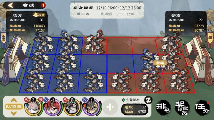 烽烟久燃,天下未定。然连年征伐非长久之计,一味鏖战非豪杰之志。今特开弭兵大会,以竞代伐,以局代野。【活动规则】1. 报名时,须按照任务条件编辑队伍。2. 最多二十名玩家为一组,组内竞逐、排名升降,全凭战斗中累计【得分】。另外,活动中可以在满足任务条件前提下重新编辑队伍。3. 不损一兵:每次战斗,都会自动满兵。不耗粮草,不损士卒~【活动流程】1. 活动开启四天,每日6:00开战,22: