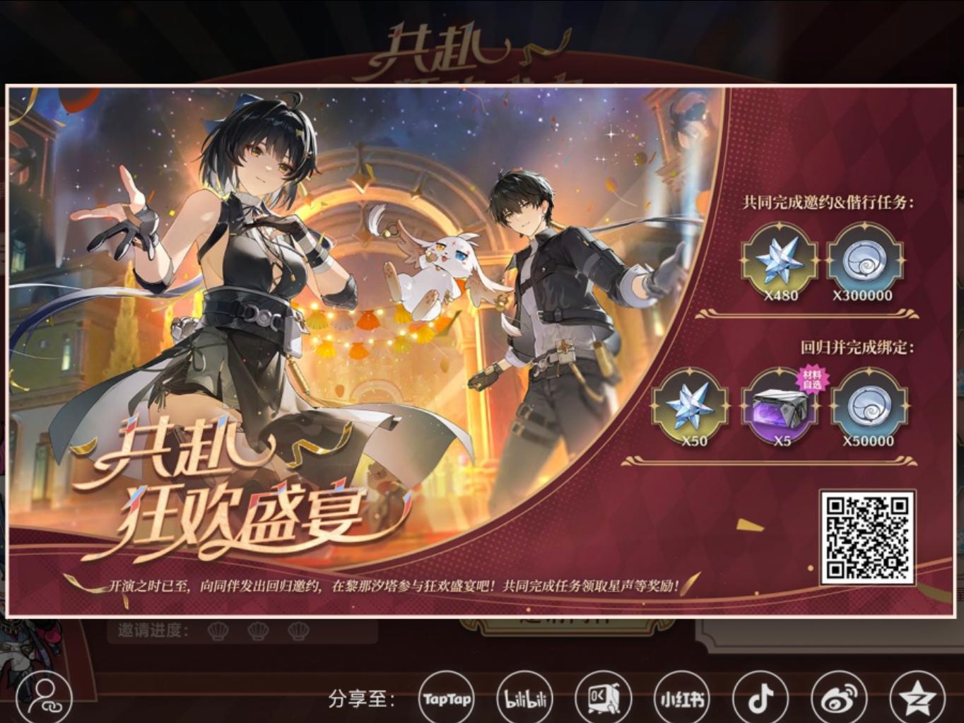 【鸣潮周年庆】您的同伴发起了狂欢盛宴邀约,完成回归绑定即可获得星声、高级拾遗封装箱。邀请其他同伴回归共同完成任务,还有额外星声等您拿! https://mc-carnival.kurogames-global.com/?source=copylink#鸣潮 #鸣潮创作激励