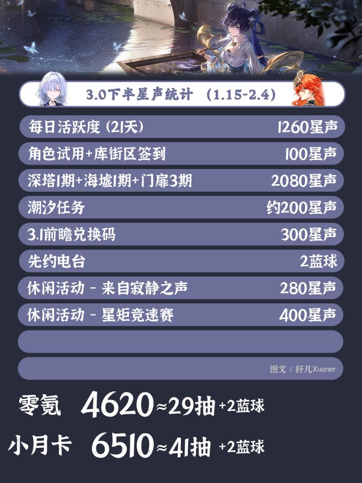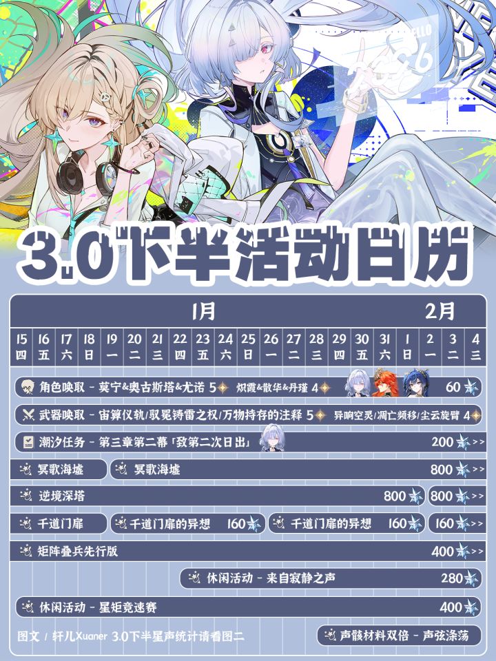 本篇攻略内容为大家总结鸣潮3.0版本下半活动和3.0下半星声(图二)注意:星声统计请以实际游戏内获得数量为准,下半应该多一些成就的星声,一起算在上半了---------------------------------------3.0下半卡池五星角色:莫宁&奥古斯塔&尤诺,四星角色:炽霞&散华&丹瑾3.0下半武器池五星:宙算仪轨&驭冕铸雷之权&万物持存的注释,四星武器:异响空灵&凋亡频移&