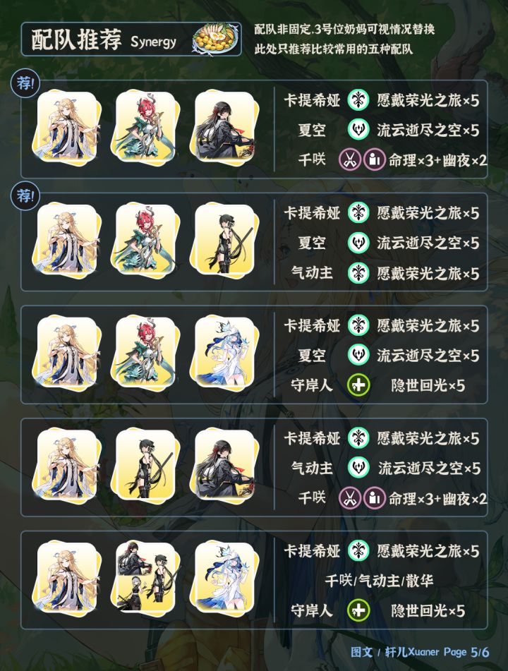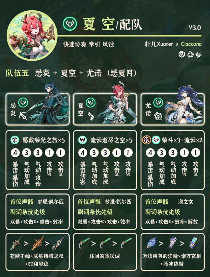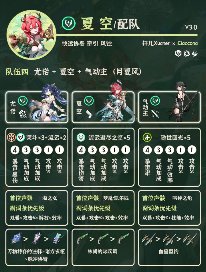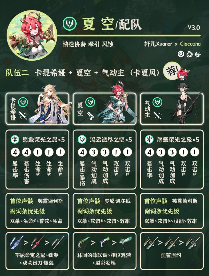 夏空复刻啦~轩儿Xuaner给各位整理了鸣潮V3.0夏空最新的配队推荐,包括队伍里每个角色声骸和武器推荐~------------------------------------------夏空:异常体系副C,可以挂风蚀效应或光噪效应。专武可以减目标气动抗性,如果进气动队,最好有个专武,对队伍提升较好。如无专武,跟卡提配队,可以考虑新常驻五星佩枪,卡提不吃老常驻攻击加成,跟其它主C搭配,可以优