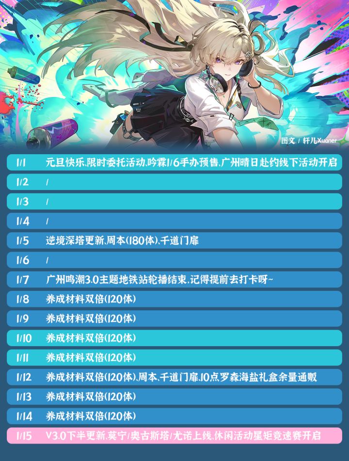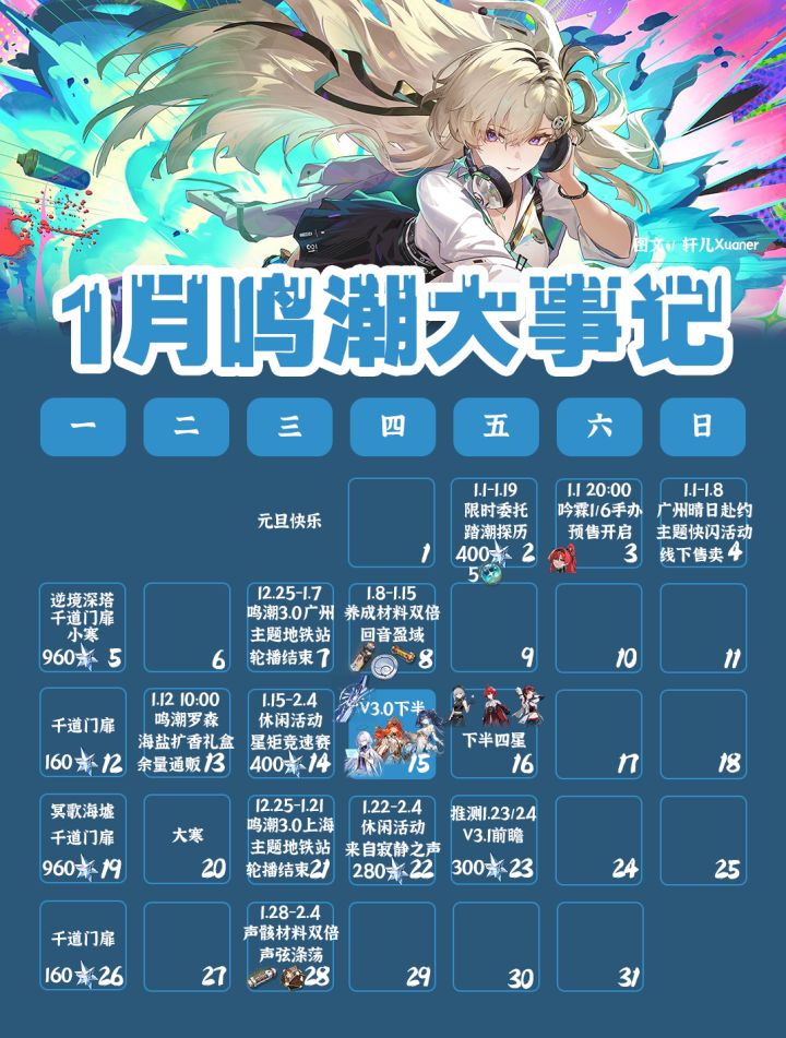 2025年快要结束啦,轩儿Xuaner提前祝各位漂泊者新年快乐,新的一年抽卡不歪~祝鸣潮越来越好~明天就是2026年1月1日啦,新的月份日历来了!-------------------① 后续日历会去掉角色生日部分,增添一些鸣潮联动、线下活动信息② 1月15日V3.0下半更新,莫宁上线,奥古斯塔/尤诺复刻。如果上半已经抽了琳奈,下半可以考虑抽新体系奶妈莫宁或者尤诺给琳奈当主C。有尤诺没有琳奈