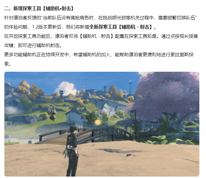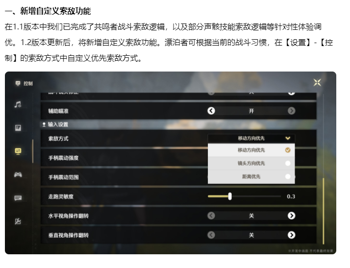 各位漂泊者们,大家好啊这里是天龙筮,本期带来的是鸣潮1.2版本优化前瞻先说大的:1.2版本下半,向全球玩家免费赠送5星共鸣者「相里要」1.2版本为「天上月华人如愿」,将推出追月节主题活动然后是优化:1、新增自定义索敌功能1.2版本更新后可以在【设置】-【控制】的索敌方式中自定义优先索敌方式。三种:移动方向、镜头方向、距离2、新增探索工具【辅助机·射击】在开启探索工具功能后,漂泊者