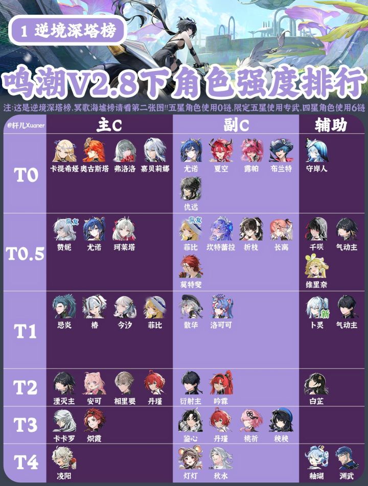 鸣潮最新V2.8下半版本全角色强度出炉!仅供参考!(注:图一为逆境深塔榜,图二为冥歌海墟榜)---------------------------------------本次更新内容:① 新增卜灵。逆境深塔榜T1,冥歌海墟榜T1。卜灵定位通用奶妈,侧重与共鸣技能输出类型主C搭配,6链加成很高,弗洛洛/珂莱塔/今汐等都可以考虑使用,可以把维里奈/守岸人解放出来用到中塔。卜灵自带聚怪功能,在海