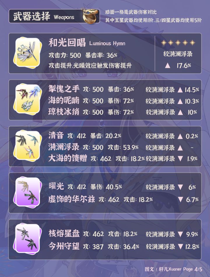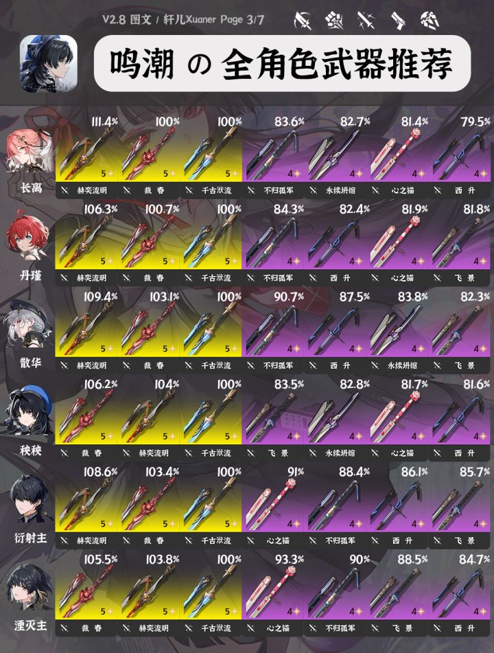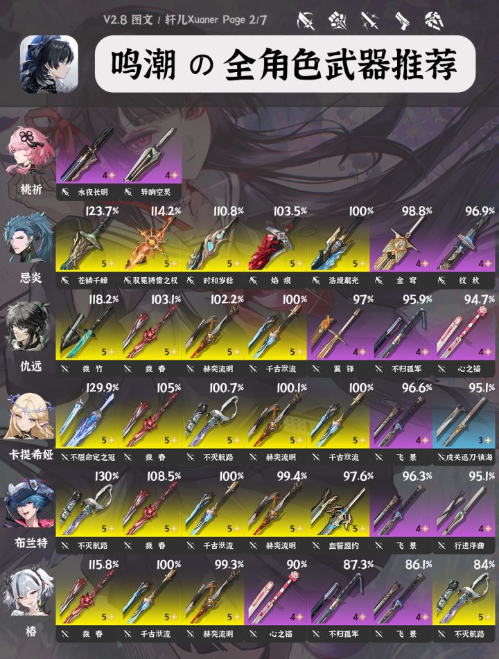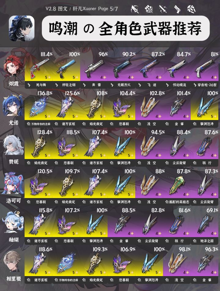 鸣潮V2.8全角色武器推荐(截至千咲共计42个角色)已更新。各位漂泊者可以作为角色培养的参考,如需了解每个角色的具体培养,可以查看各角色一图流~----------------------------攻略食用指南① 目前部分角色部分武器数据还未进行梳理,后续3.0版本预计会更新一批老角色的新武器数据。② 武器右上方百分比数字为角色携带该武器个人伤害体现,大部分角色以常驻五星武器为100%基