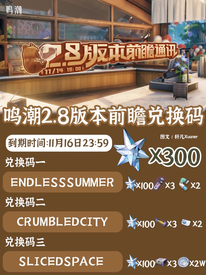 鸣潮2.8版本前瞻通讯三个兑换码来啦,大家不要忘记领取~兑换码一:ENDLESSSUMMER兑换码二:CRUMBLEDCITY兑换码三:SLICEDSPACE2.8版本会迎来两位新共鸣者:千咲(五星湮灭长刃)和卜灵(四星导电音感仪),菲比、弗洛洛和坎特蕾拉将会迎来复刻,刚抽完赞妮的漂泊者可以补菲比啦~千咲和卜灵的材料轩儿也会及时为各位整理~2.8上半卡池:千咲+菲比2.8下半卡池