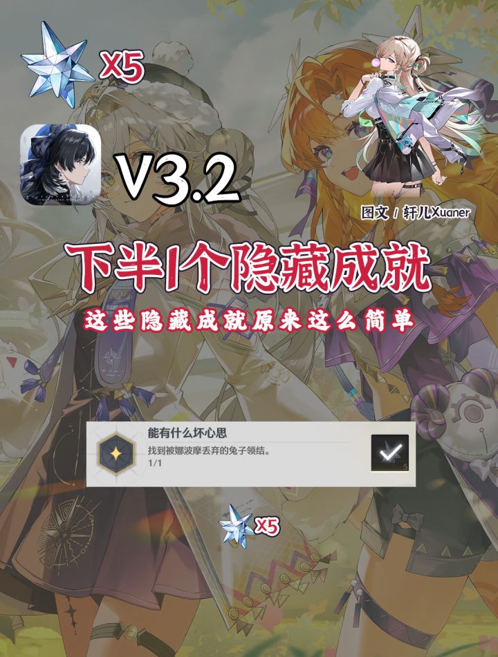 轩儿Xuaner给各位整理了鸣潮3.2下半版本1个隐藏成就~-------------------攻略食用指南① 隐藏成就【是指未在成就列表中列出的成就】,只有在你完成该成就后才会显示出来。一般包括一些大世界探索的彩蛋、记闻任务成就等。一些没完成时就显示在成就列表中的世界成就不算在轩儿的隐藏成就内~② 每页图文展示隐藏成就的地点和完成流程,漂泊者按照顺序操作即可③ 3.2下半1个隐藏成就