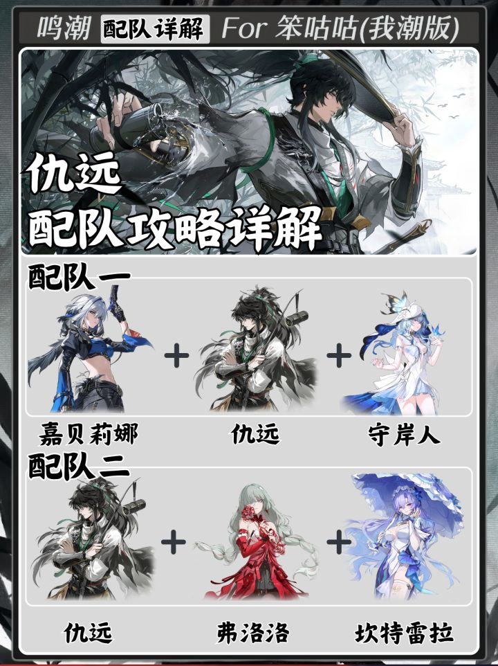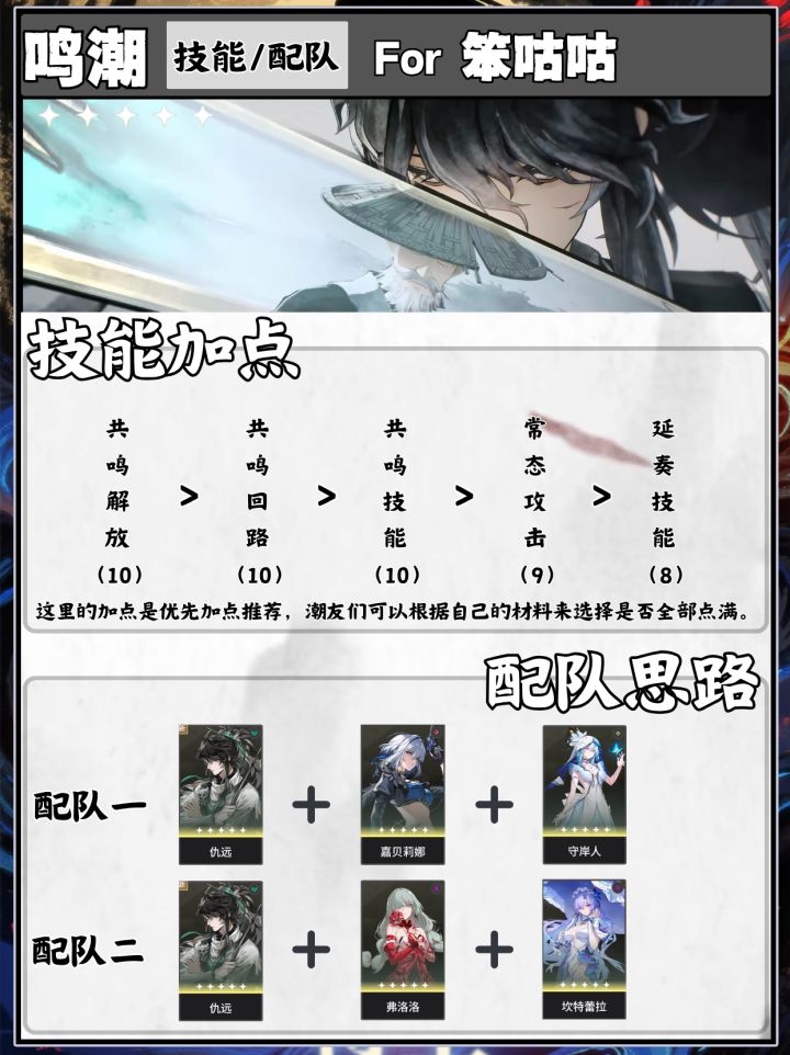 哦呀!这里是Moealkyne! 本期为大家带来的是【鸣潮】V2.7仇远的养成攻略~【此角色一图流适用2.7正式服!相关数据已经过游戏内查询~】【正式服UID:100532881】本篇攻略将会按照培养素材需求、技能优先级推荐、武器推荐、声骸推荐、共鸣链分析、配队建议等多个方面,详细剖析该角色的方方面面!一图流看这里!一图流后还附有文本解析~此处是仇远的文本解析! 仇远为气动副c,主要伤