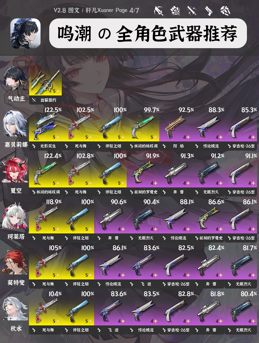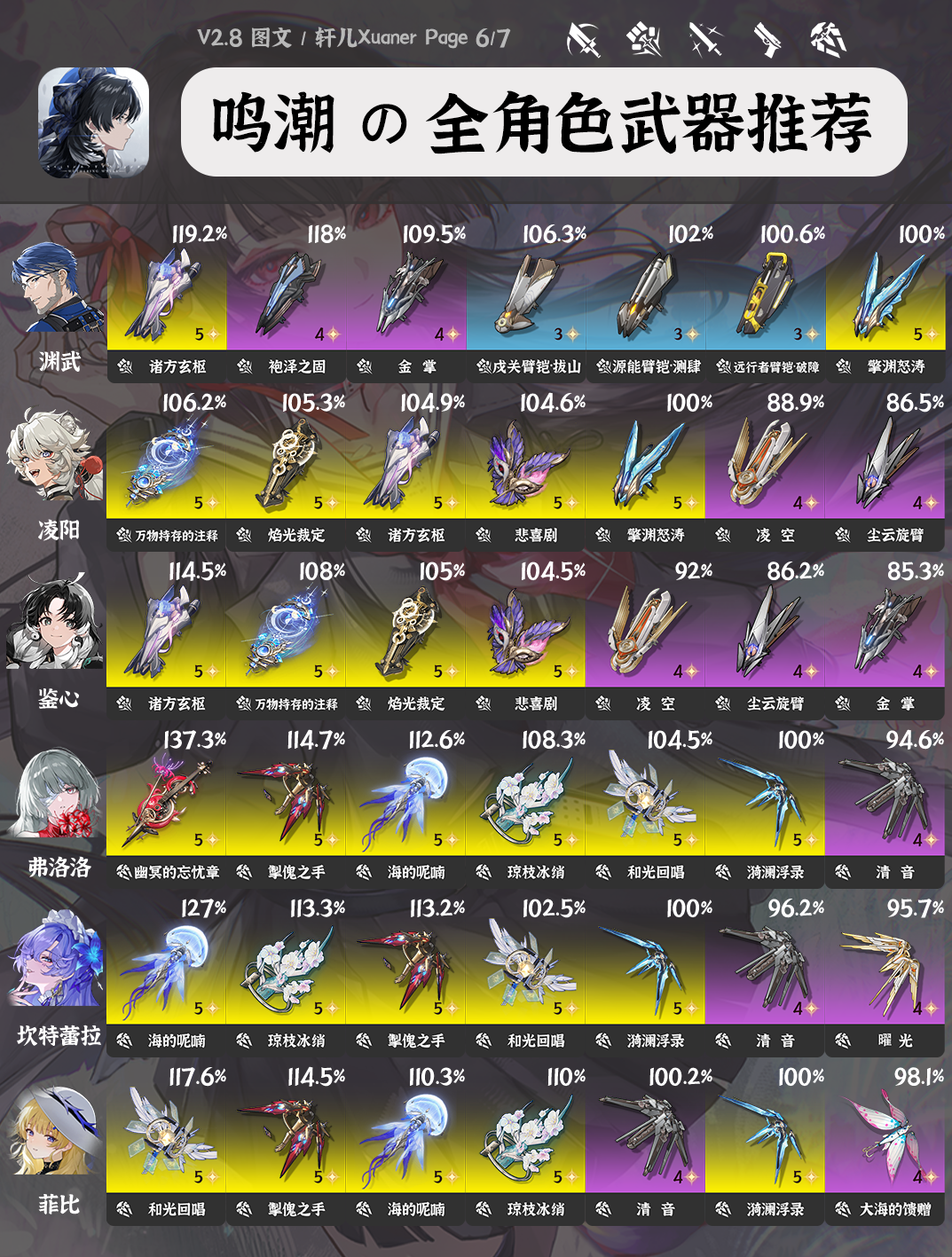 鸣潮V2.8全角色武器推荐(截至千咲共计42个角色)已更新。各位漂泊者可以作为角色培养的参考,如需了解每个角色的具体培养,可以查看各角色一图流~----------------------------攻略食用指南① 目前部分角色部分武器数据还未进行梳理,后续3.0版本预计会更新一批老角色的新武器数据。② 武器右上方百分比数字为角色携带该武器个人伤害体现,大部分角色以常驻五星武器为100%基