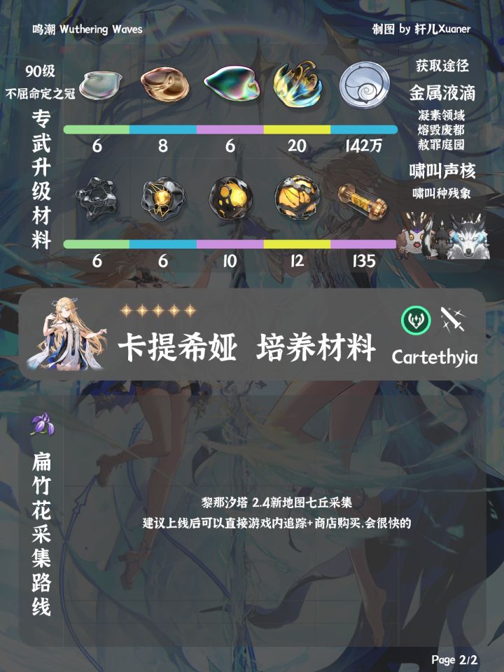 Hello,这里是你们的老朋友轩儿Xuaner~本期攻略内容是卡提希娅培养材料,想要抽卡提的漂泊者可以准备起来了,包括卡提希娅突破升级材料、技能升级材料、专武突破升级材料。------------------------------------------------① 金属液滴系列:凝素领域·熔毁废都(瑝珑归墟港市焚焰海)、凝素领域·赦罪庭园(黎那汐塔遗颂河谷右侧)② 潮蚀帆核系列:受黑