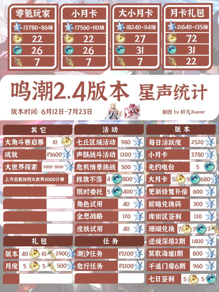 鸣潮2.4版本星声统计来啦!各位漂泊者可以获得多少星声呢,随轩儿Xuaner一起看下吧~2.4版本共有两位新共鸣者上线,分别是卡提希娅和露帕。大家可以根据自己的卡池情况合理安排资源。具体数据请以最终上线内容为准~------------------------------------总数按照大世界2000星声计算① 零氪玩家可获得13780星声约86抽+22金球26蓝球7铸涛波纹② 小月