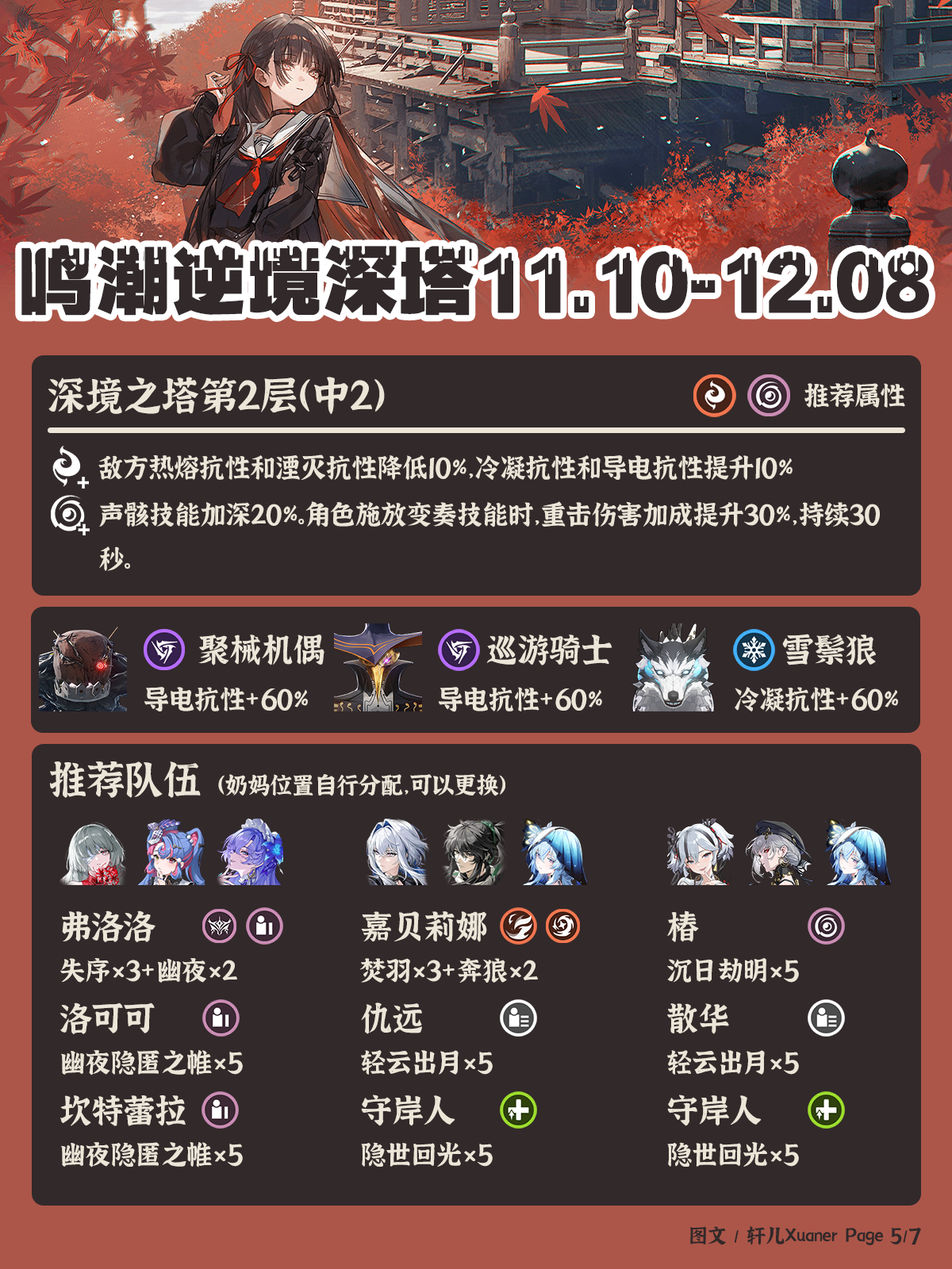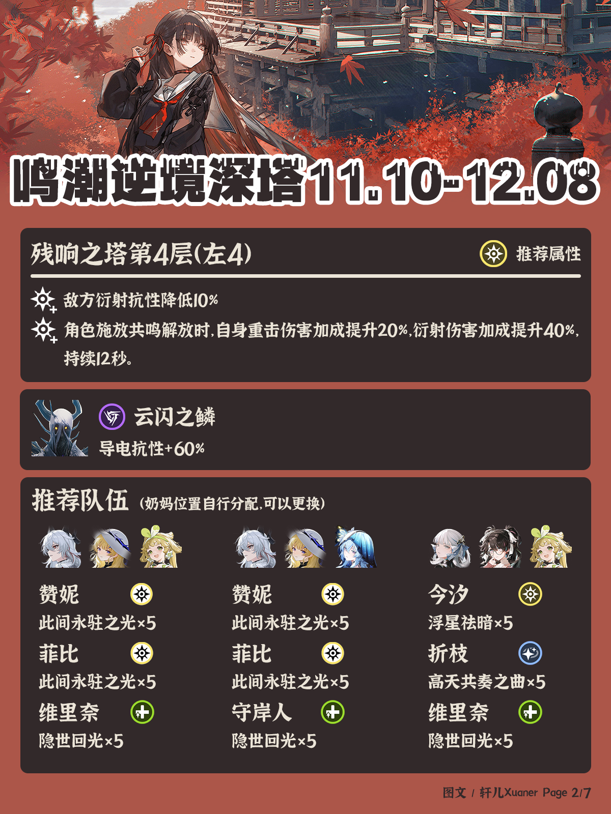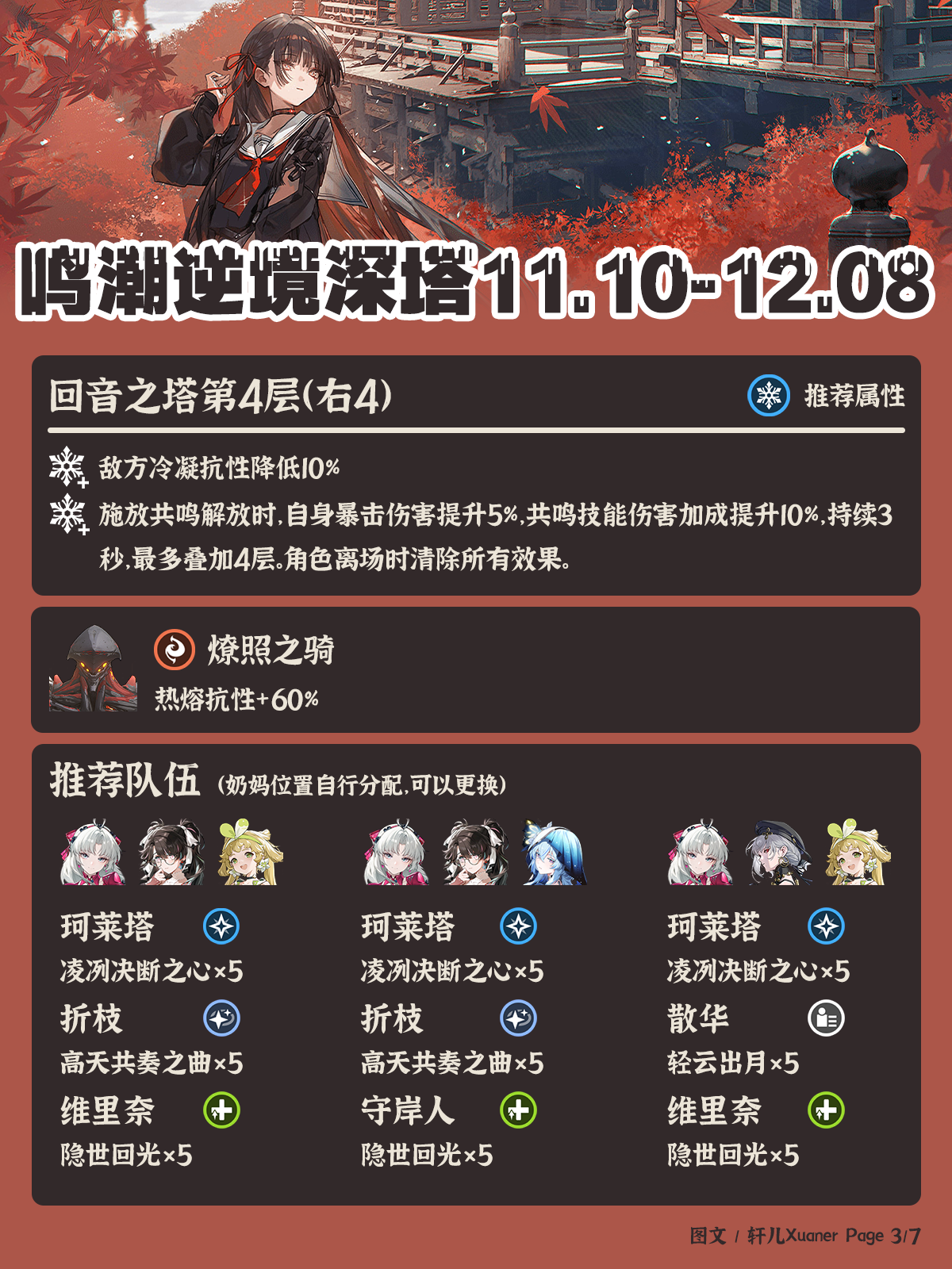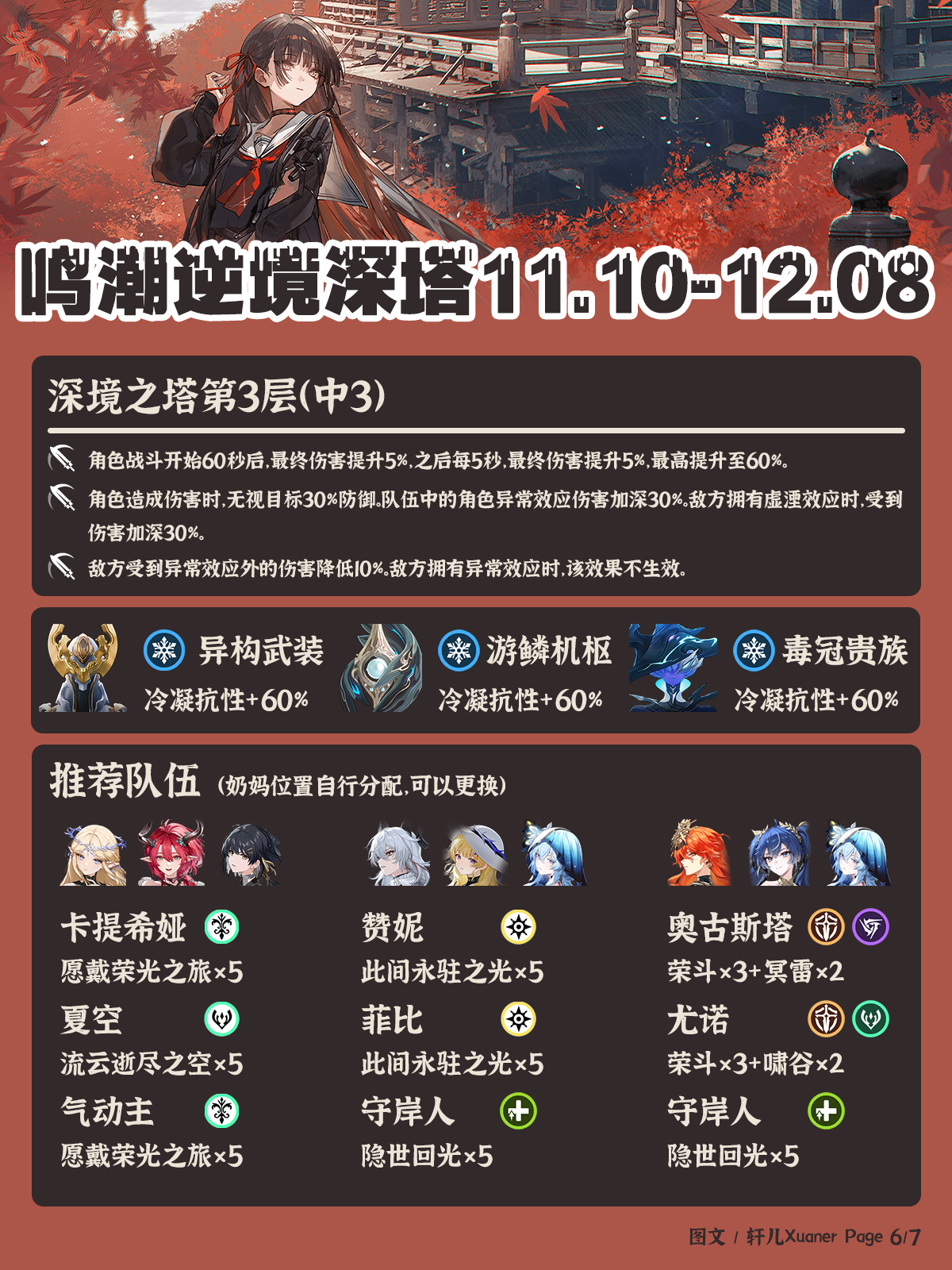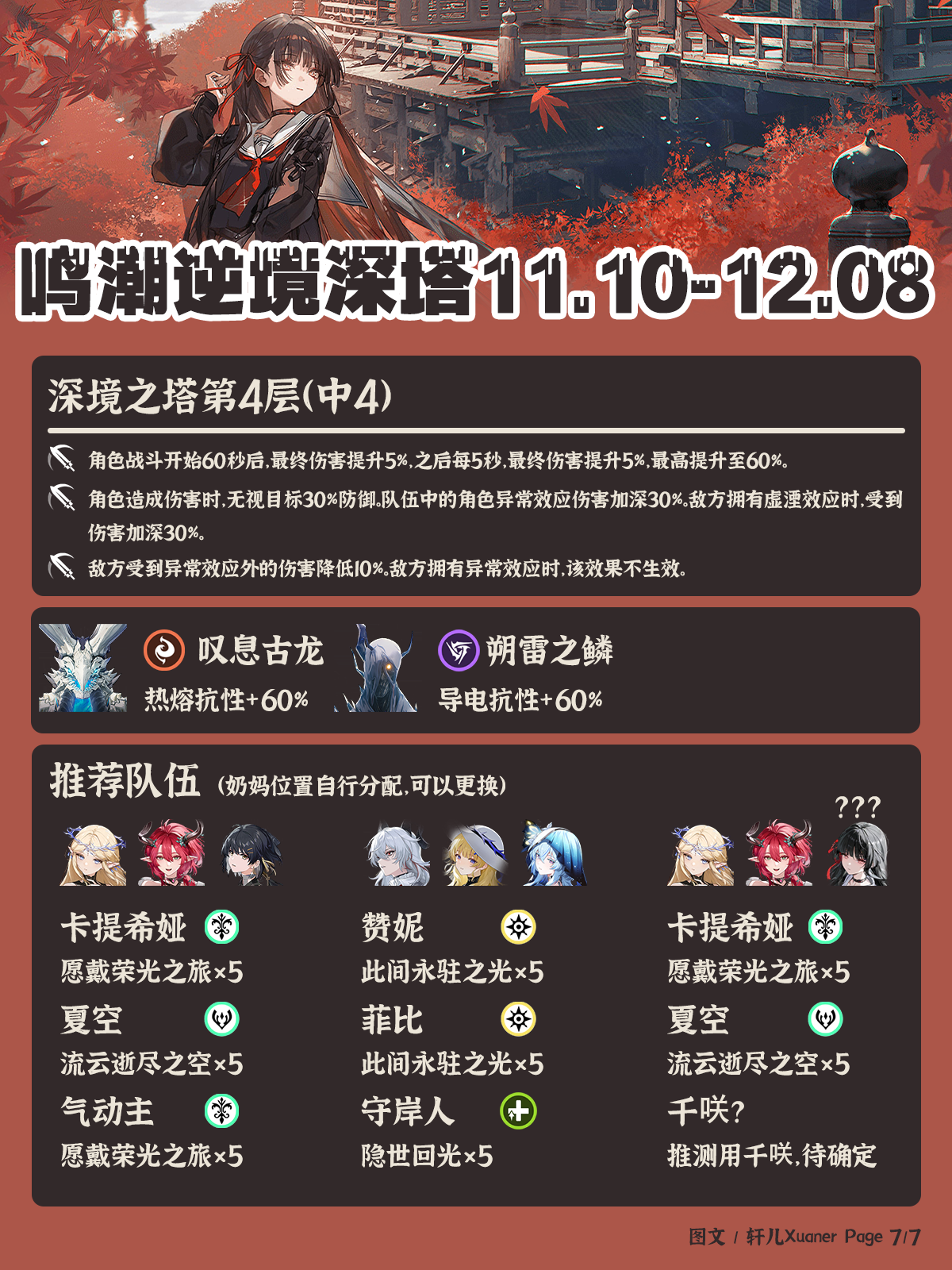 中午好,各位漂泊者!轩儿Xuaner根据呼声比较高的诉求新增了一个队伍强度排行系列,后续会按照版本进行更新~叠甲:此排行为个人观点,如有不同观点可以指出,轩儿也会综合各方观点进行优化。请阅读以下指南后再查看图片内容或与其他玩家讨论~----------------------攻略食用指南① 此排行限五角色均为0+1或0+0,也就是0链范围内进行讨论。如果你的角色有更高的共鸣链,伤害一定会大