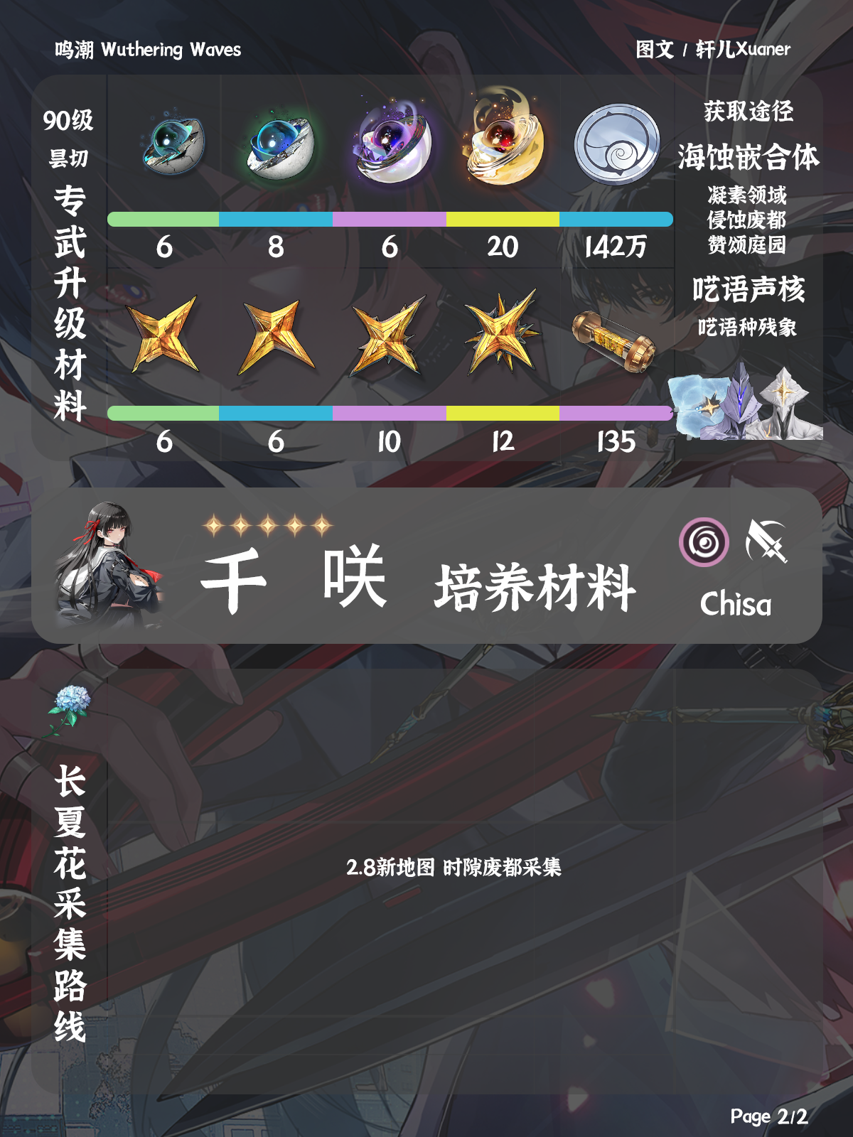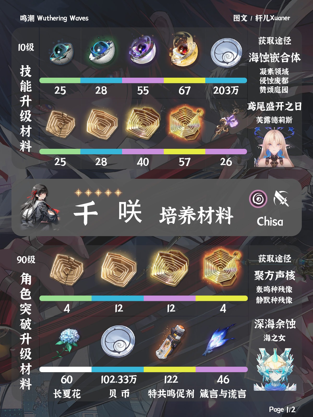 漂泊者小助手轩儿Xuaner已为您整理好千咲材料~本期攻略内容是千咲培养材料,想要抽JK的漂泊者可以准备起来了,包括千咲突破升级材料、技能升级材料、专武突破升级材料。--------------------------① 海蚀嵌合体系列:凝素领域·侵蚀废都(瑝珑虎口矿场右下)、凝素领域·赞颂庭园(黎那汐塔青栎庭院右上)② 呓语声核系列:呓语种残象敌人掉落(瑝珑乐师、守卫、猎手、五小只、战士