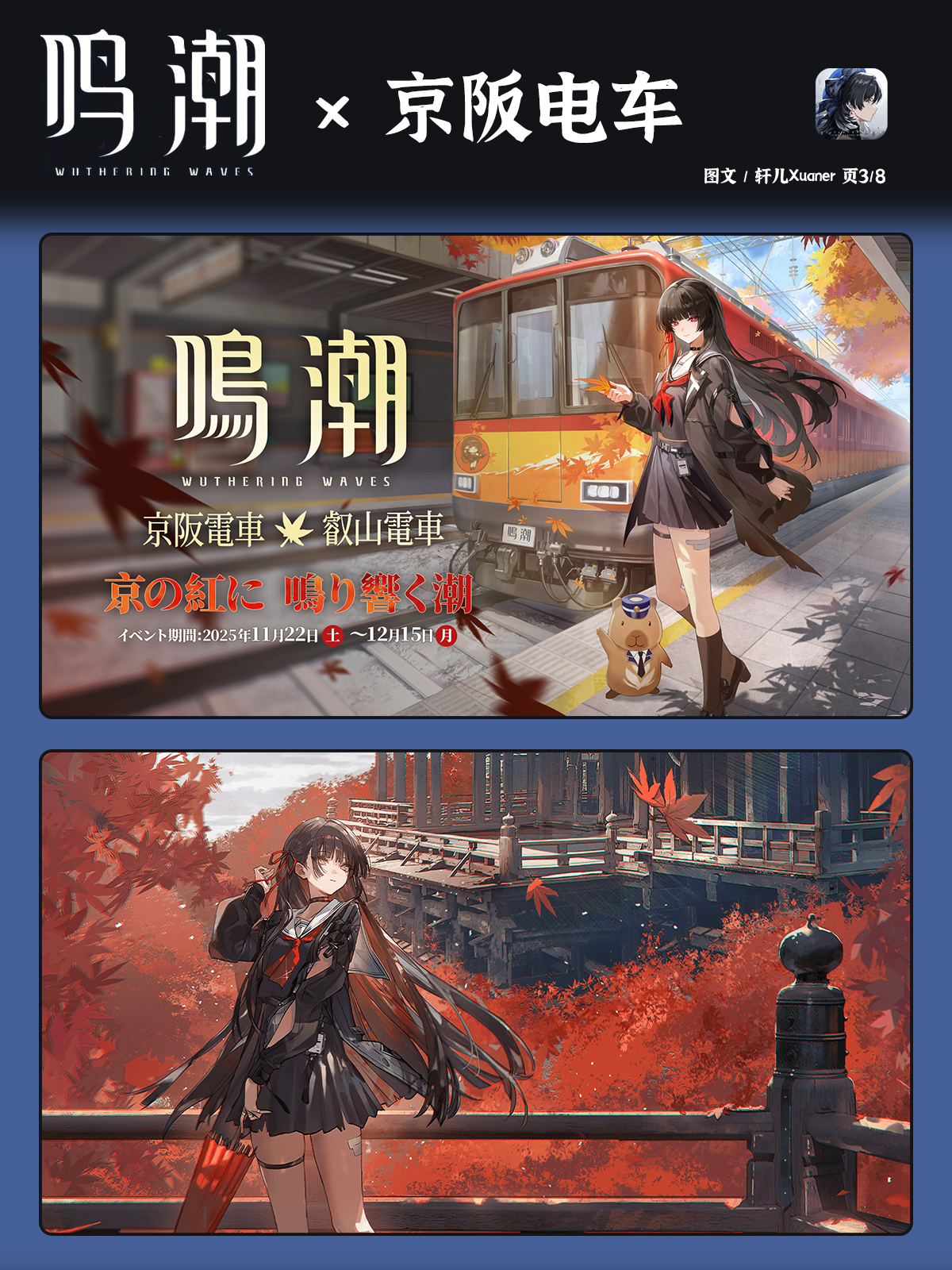 各位漂泊者,轩儿后续也会为大家定期整理一些鸣潮的联动消息,各位可以根据自己的喜好和位置去参与------------------------① 鸣潮×CoCo:官方还没有发布相关消息,CoCo发布的消息,根据图上的时间和鸣潮2.8版本推测应该是联动,敬请期待!② 鸣潮×京阪电车:在日本京都的联动,非常适合千咲的主题。③ 鸣潮×凯岩咖啡:在中国台北的联动,有相关周边出售~④ 鸣潮×红魔手机
