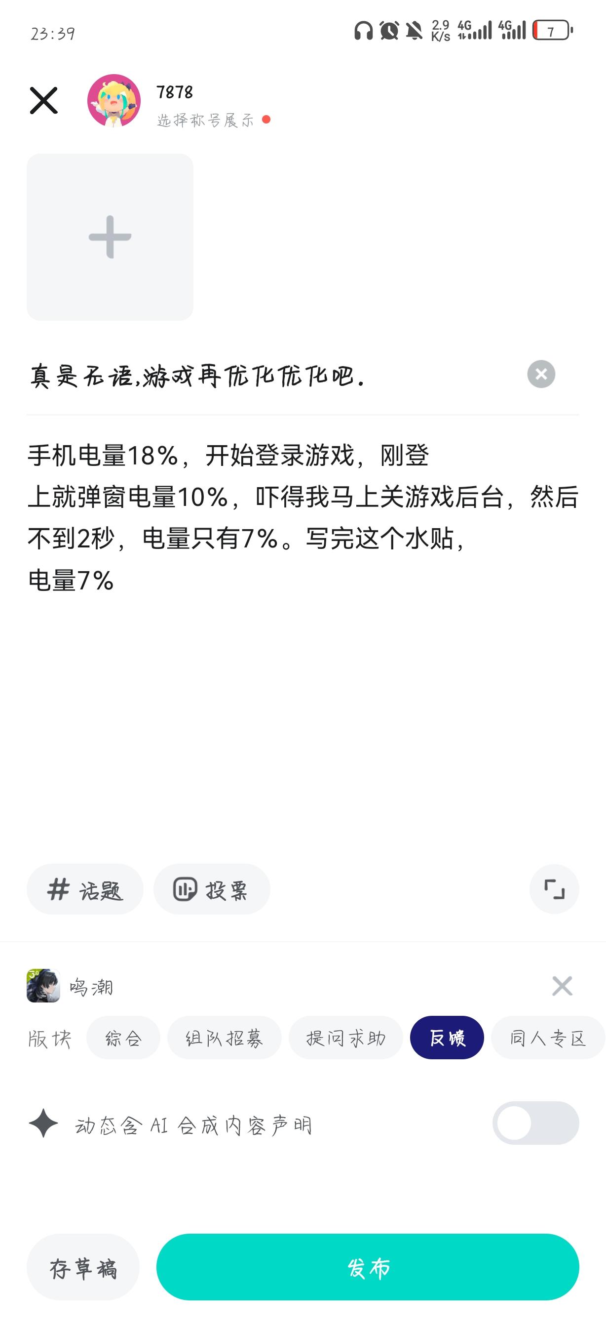 手机电量18%,开始登录游戏,刚登上就弹窗电量10%,吓得我马上关游戏后台,然后不到2秒,电量只有7%。写完这个水贴,电量7%