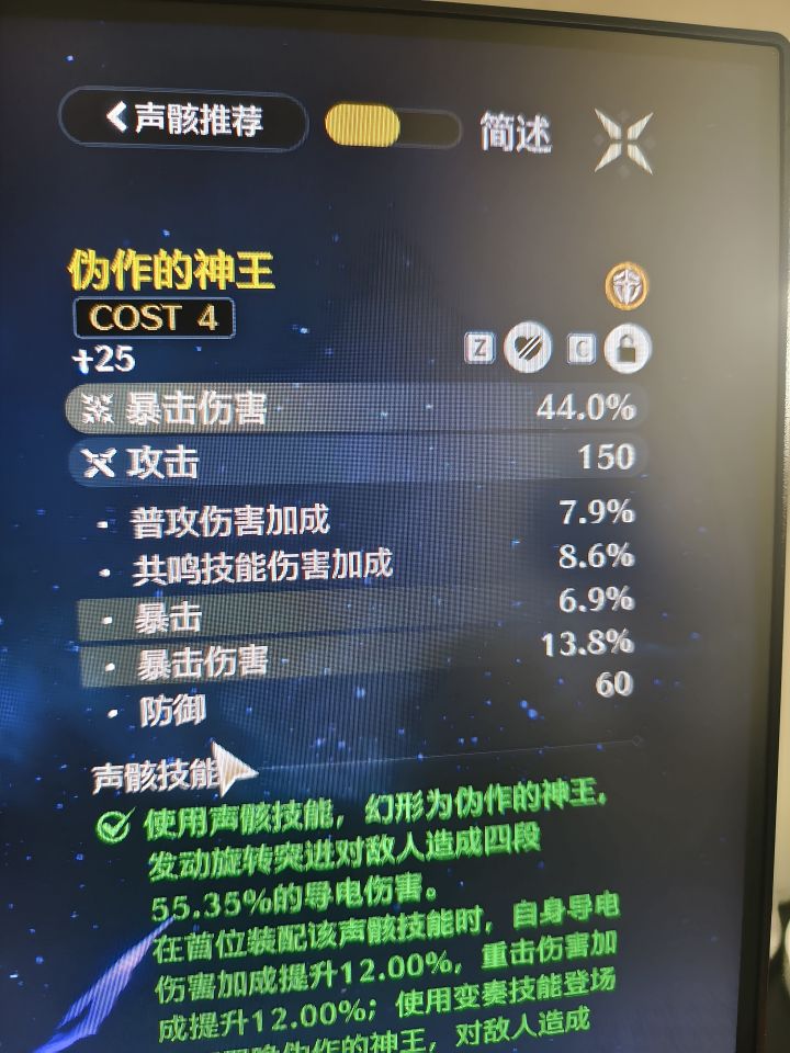 各位大佬们这两个声骇,奥古斯塔(0+1目前70级)戴上之后的面板分别为:C4暴击:2344 80.5 229.8C4爆伤:2256 58.5 271.4这两个守岸人金色领域和老莫buff吃满后分别是:C4暴击:2802 91 271C4爆伤:2714 69 313这是大概数据,而且目前只有这两个过渡,因为目前只有70级所以上面数据按我的理解是还要加上技能没学习的6点暴击以及武器白值的1