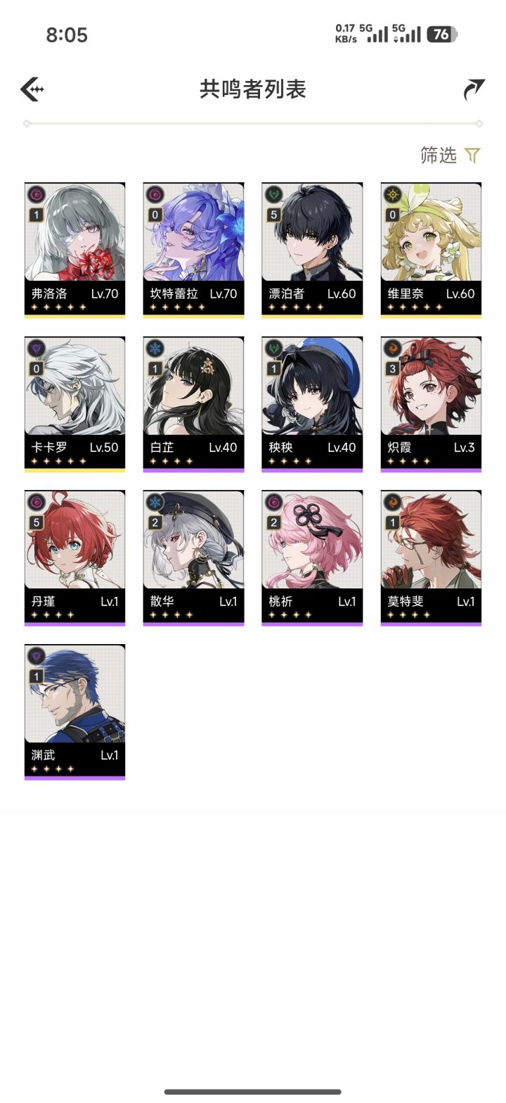 忌炎,莫特斐,维里奈,安可,卡卡罗,秧秧,渊武,丹瑾,散华,桃祈,白芷,炽霞,弗洛洛,卜灵,灯灯。#鸣潮