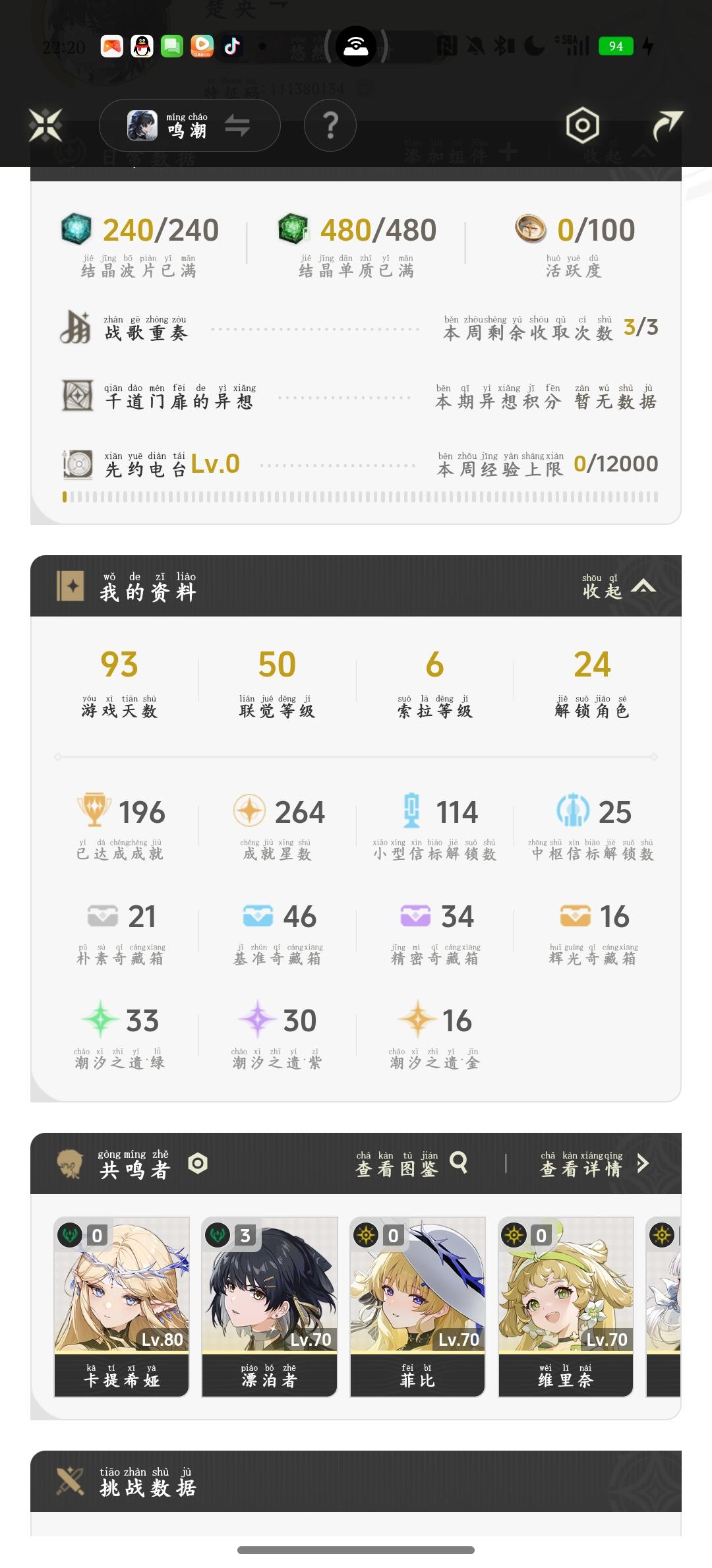 这个夏空对我超好武器是当时送的十连,抽出来的角色本体也是这个版本送的那发十连,小保底没歪看看我这地图探索度,游玩时长和天数就是深渊,还有什么海虚?我这些都没怎么打过,所以我名字可能记不太清楚每个版本就靠福利过日子了,虽然角色,专武,命座确实不多,但就我目前玩成这样,其实也正常所以鸣潮你真的乘乘的玩的真的很休闲,很舒服了