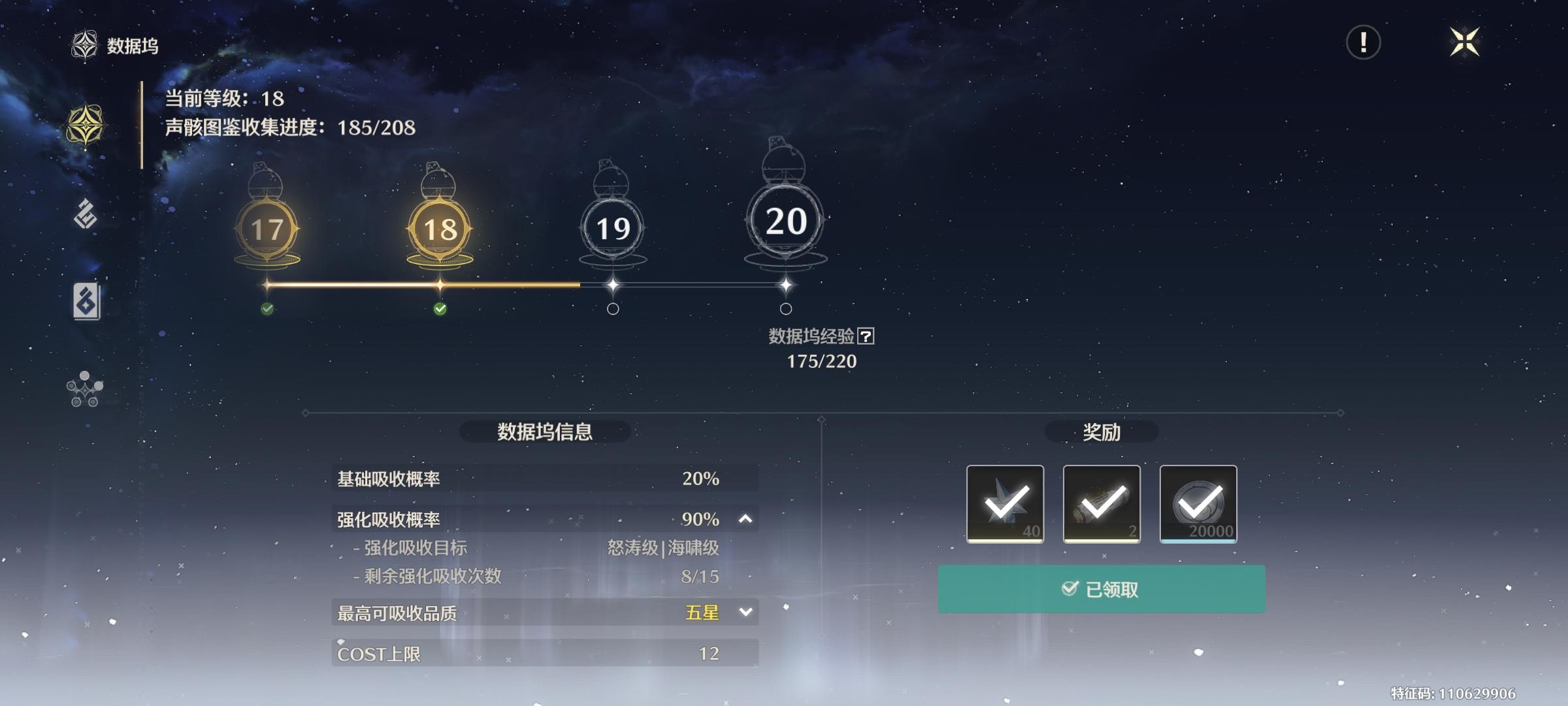不得不说这个出金率就算是小学生都会质疑你们的算数水平。数据坞18级50%出金概率,但一直觉得出紫的概率更高,不过因为没有认真算过所以也不好说,但是连续十次左右都是紫的情况真不少见,连续五次以上出金是几乎见都没见过,你管这叫50%吗?今天刚好周一,强化吸收次数重置了,我就去打燎照之骑给安可刷声骸,我是定定站在那里等他刷新,打完了15次强化吸收,连续的,中途没去打过别的,就定定在那等。结果呢?15