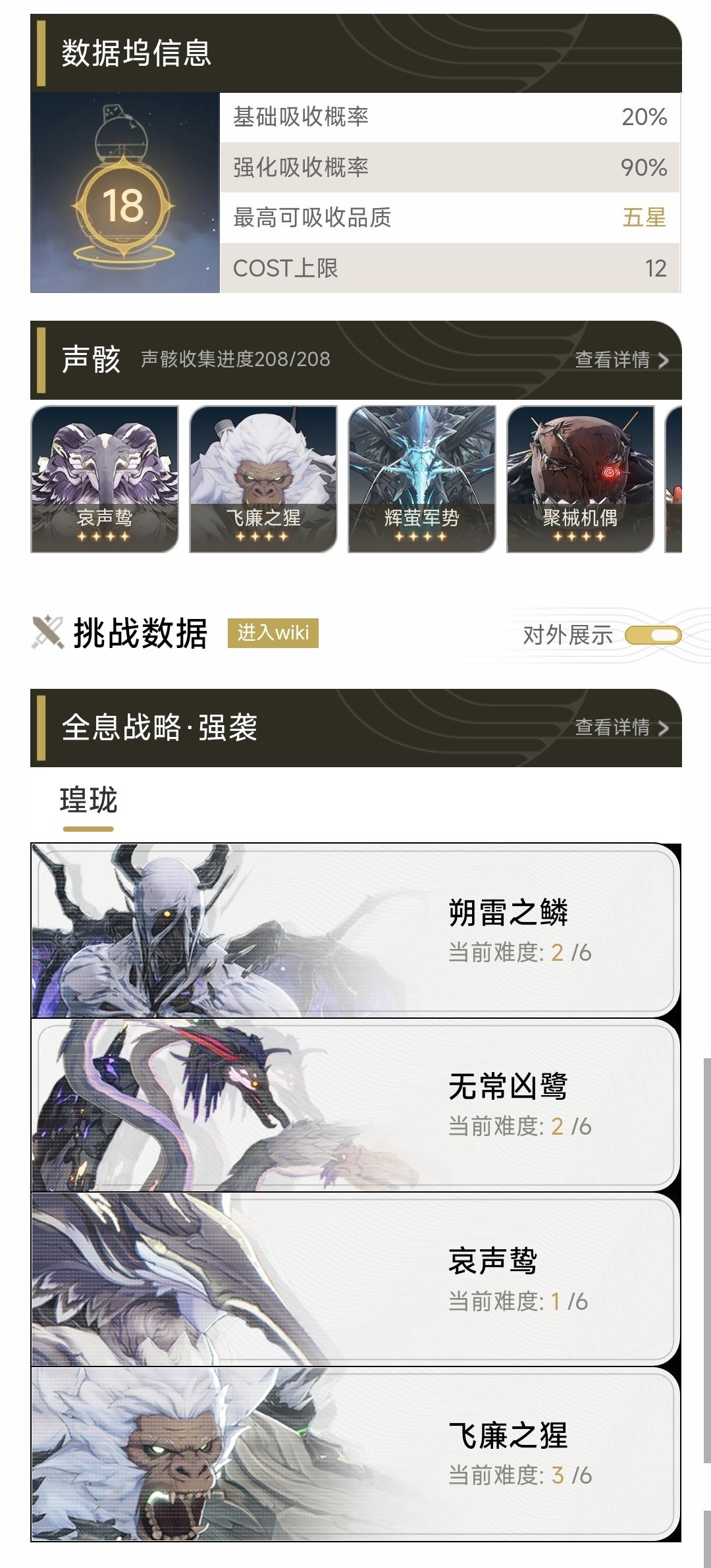 pc端越优化越卡,今天卡到只能用手机完了,深渊很离谱,开到100级狮子猿,但是不氪金声骸狗粮卡的这么狠谁有练度呢? 要不不开这么深,要不别卡狗粮,昨天的声骸bug优化压死了最后的稻草,直接从准主二次游,变成副游了,太离谱了,最离谱的是在游戏邮件前几分钟刚氪完大小月卡。干!干!干!!!今天开始打全息,很有意思,有点魂类游戏的感觉了,但特效调到最低,角色特效也太多了,狮子猿打完三就没法打了,特效太多,