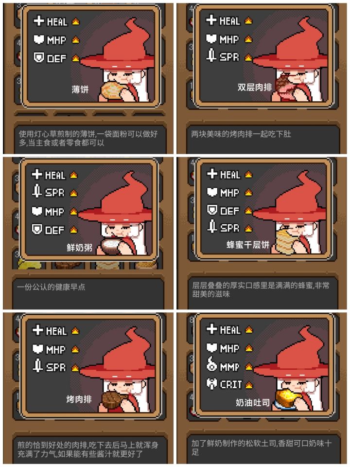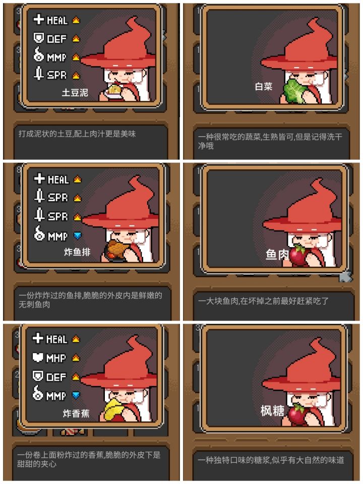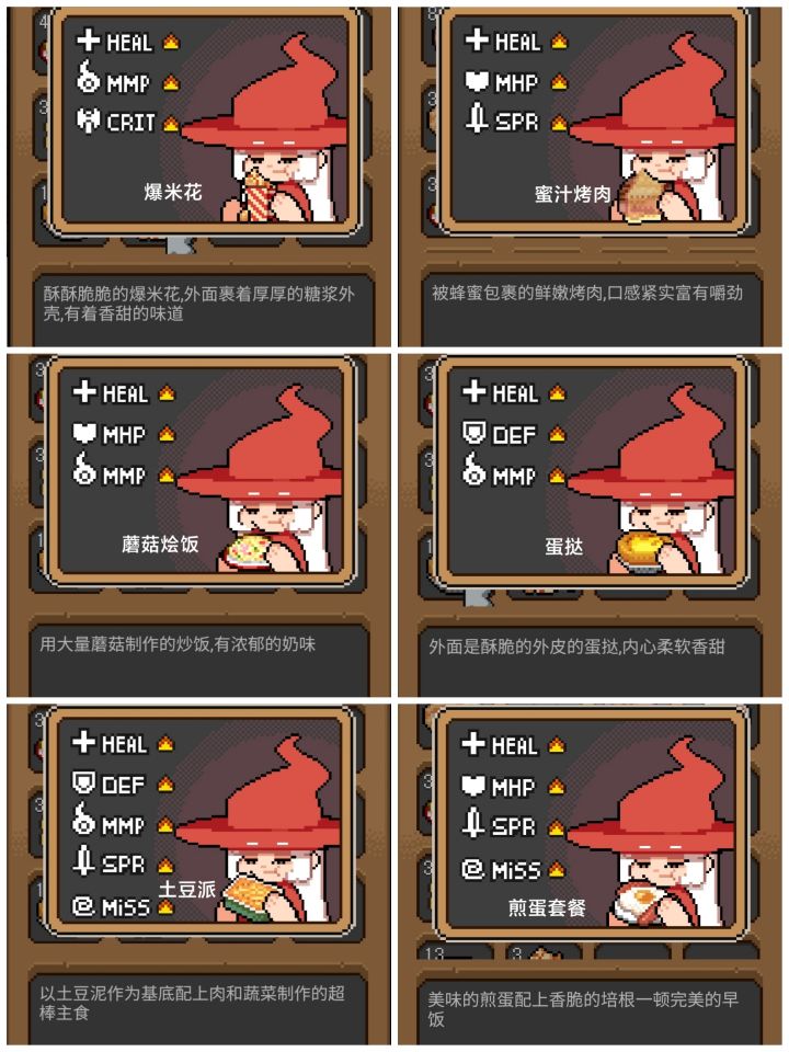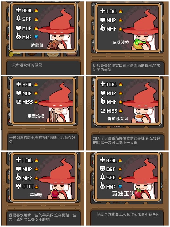 目前能吃的食物以及属性加成 图1-图6(所有食物第二次吃只加HEAL)发现的种子与花盆 图7-图9(黑猫盆种的是可持续收获植物)