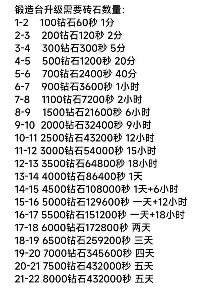 锻造台进阶升级所需时间,重新做了个一目了然版,原版全是秒数瞅着就蛋疼
