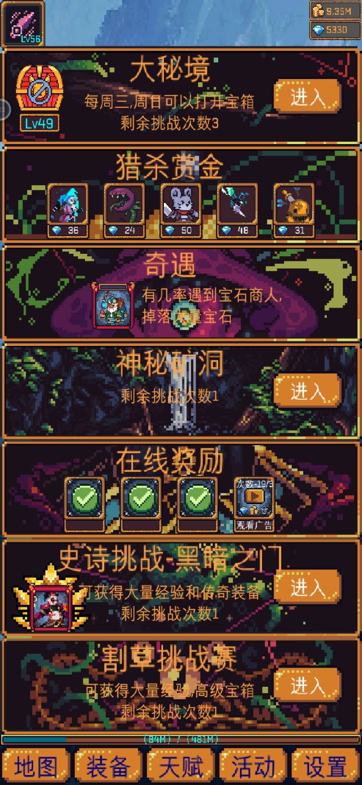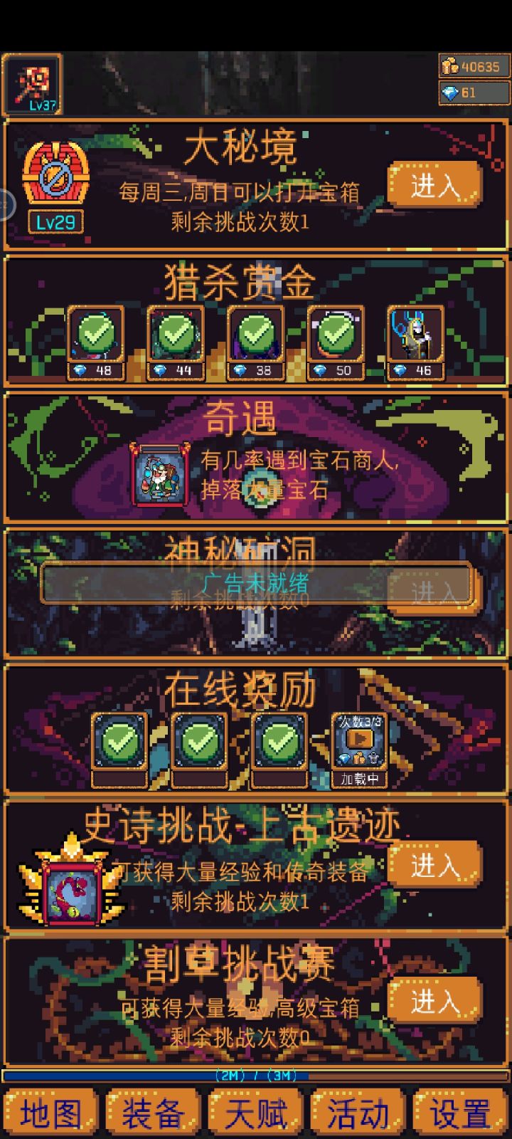 人物走路卡顿严重情况下,我想说如果无法解决不能让人物流畅移动的话,我们能偷换概念让玩家做活动吗?1,矿洞挖矿图大我知道作者想让我们多参与操作,针对方式:首先让玩家选着三个难度,怪等级(-3,0,+3),对应传说矿石发现率增加和普通减少,图做一个7*7的方块图,随机出现14-20块(破坏一块出现一块)。时间环节,作者你来选择。2,史诗挑战,玩家等级上去后。boss伤害防御很变态。所以活动也是三个