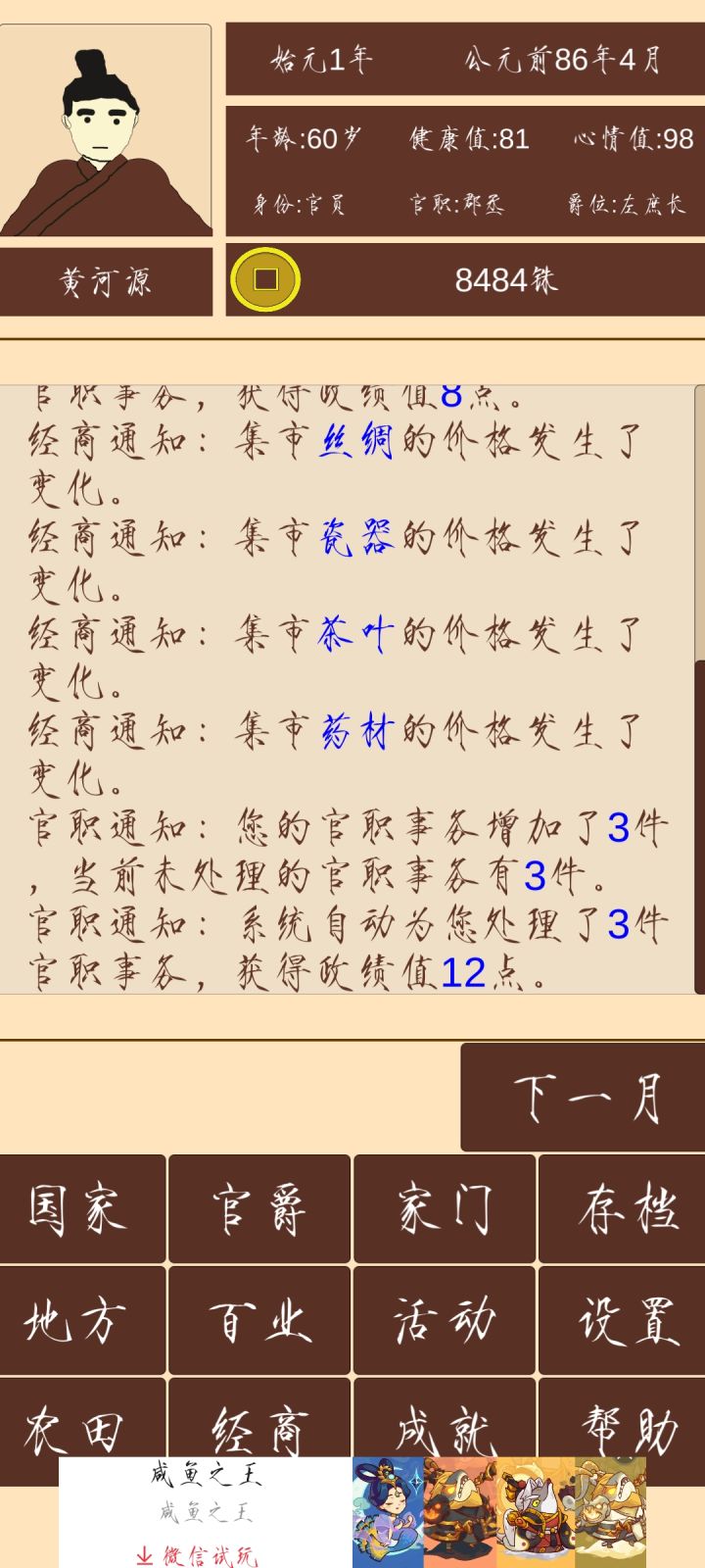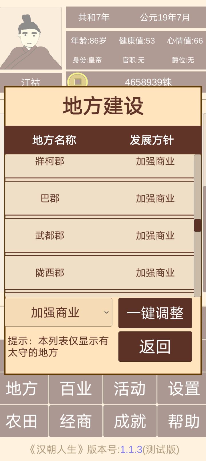 可不可以弄得像门客任务一样,选择方针之后地方官员数值够的就定下这个方针了,数值不够的地方官员则显示“无”或者“停止建设”,然后针对这部分官员再一键调整成其它方针
