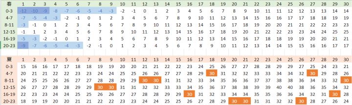 几年没玩了,回坑之后被狠狠地爆金币。想着以前玩的时候不明不白的,干脆扒一扒游戏的数据。鄙人愚钝,挖出来的数据与实测仍有差距(大概1~2℃),不敢妄议,仅将阶段性成果展示出来,抛砖引玉。世界温度由三者组成:当日在季节中所处的时间,当日时刻与当前天气。当日时刻的温度修正每四小时更新一次,每天循环,从零点开始为-7,-2,+2,+4,0,-4。天气修正为:晴天+2,多云0,雾-2,雨-4,风暴-