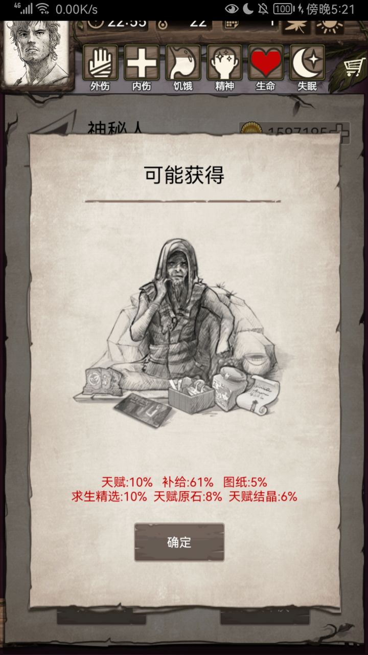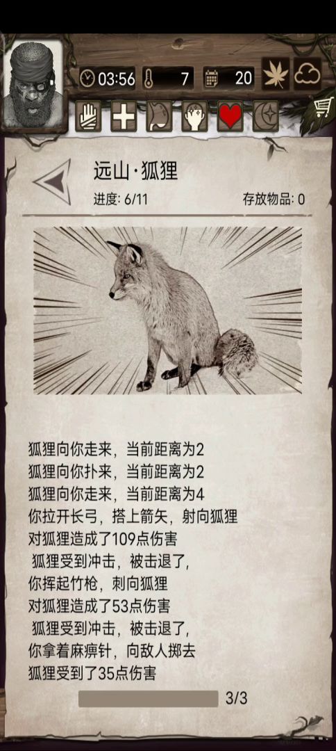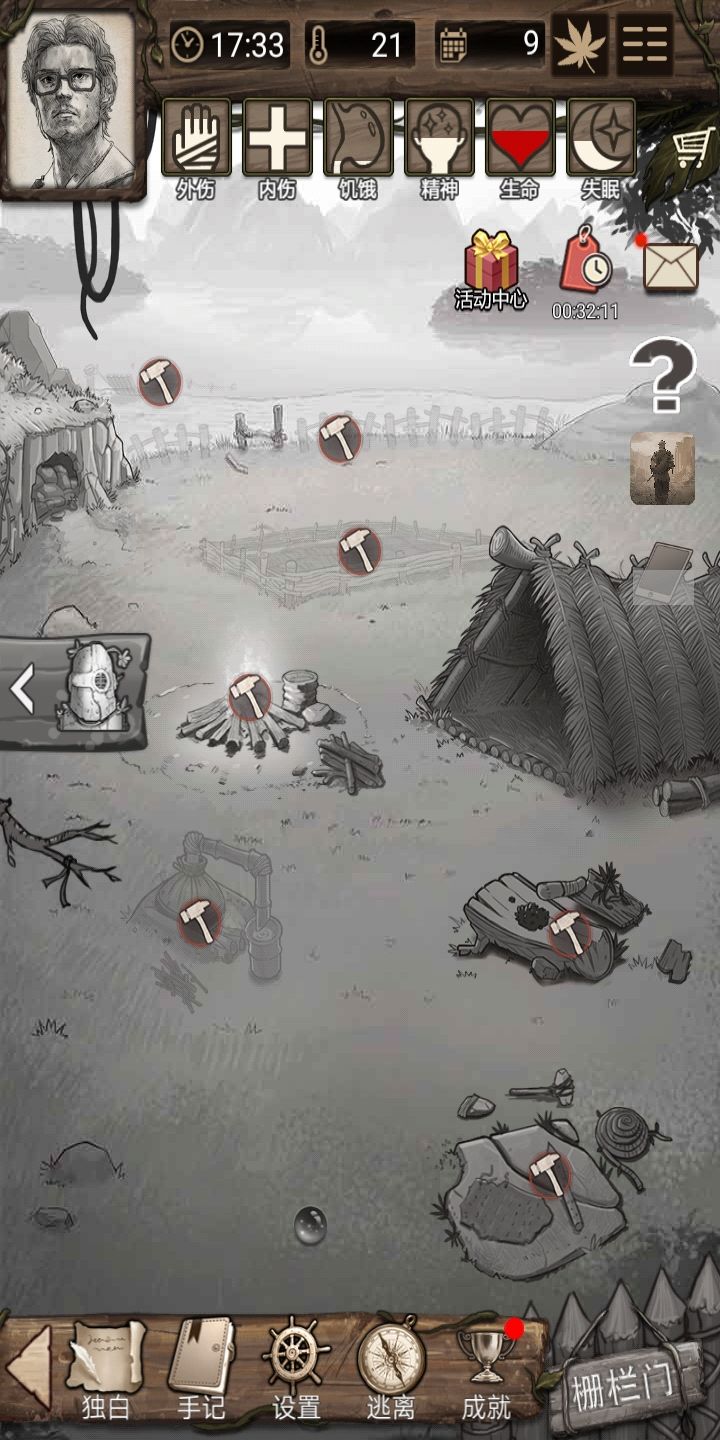 1 点开人物头像就能吃东西,吃药,装备物品2 怎么逃离?,注意右下角有一个箭头点开箭头就能看到触发的逃离方式,如果没有逃离方式则是没有触发。3 怎么才能不被狼偷东西?有广告的清后台。没广告的养狗,狗的状态在晚上24点不低于30就不会被偷血量120以上。护栏基本没什么用该偷还是偷,有条件的4天的时候建个1级的就够了