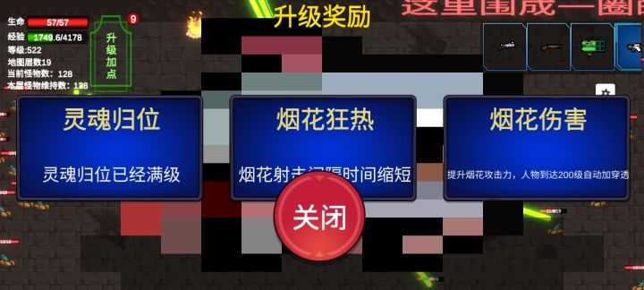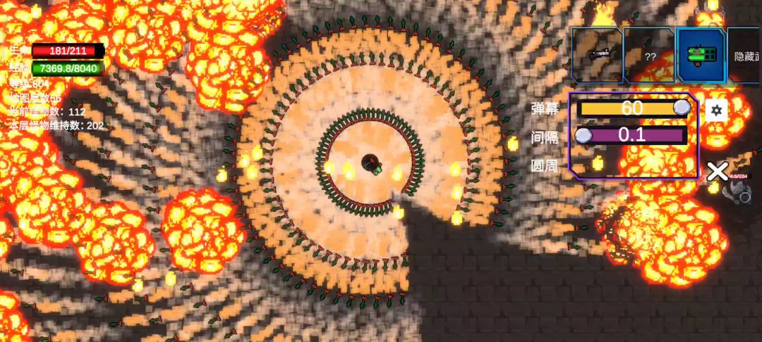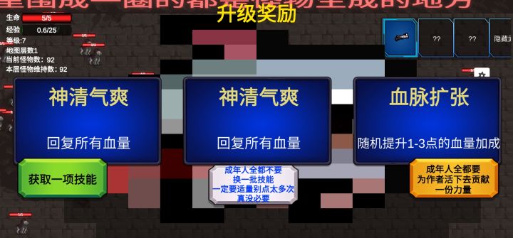 玩了一下,开始是抱着割草爽感来的。我有一点点个人建议现在升级每次选择带来的强度变化却很微弱,除了增加弹幕,其他变化都不是很明显,不够爽。可以增加每次升级变强的幅度增加武器,丰富攻击方式。后期可以加上穿透、防御、魔法伤害之类的就更好了。比如一些范围魔法火焰攻击,有击退效果的龙卷风,天上掉下陨石可以造成范围伤害和击退效果,有穿透效果的子弹等等都是自动攻击,一个参与感下降,另一个操作性下降,如果是考虑攻击范围可以做成超出攻击范围的手动攻击子弹会消失升级的属性太多了,可以到一定等级后允许屏蔽一部分不想要的升级属性,比如每十级增加一个屏蔽格(可屏蔽也可不屏蔽),让一些玩家可以专精自己喜欢的武器,或者干脆可以删除不想要的武器