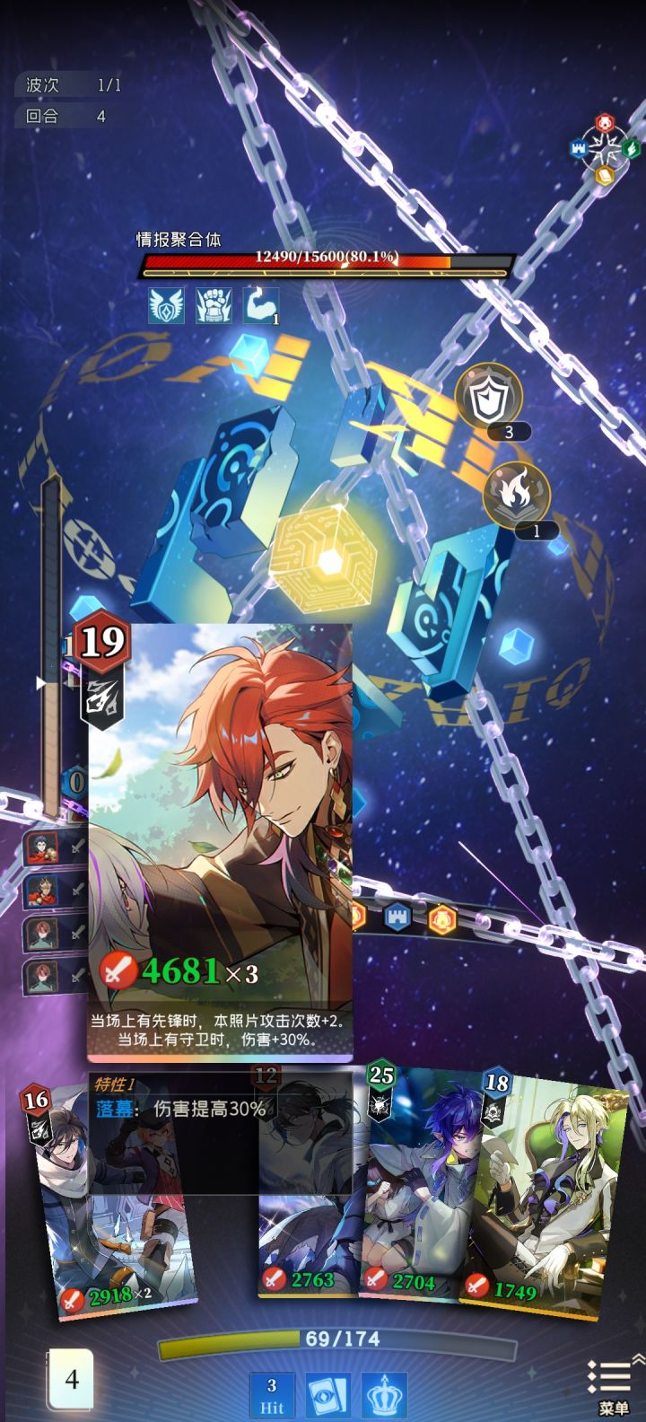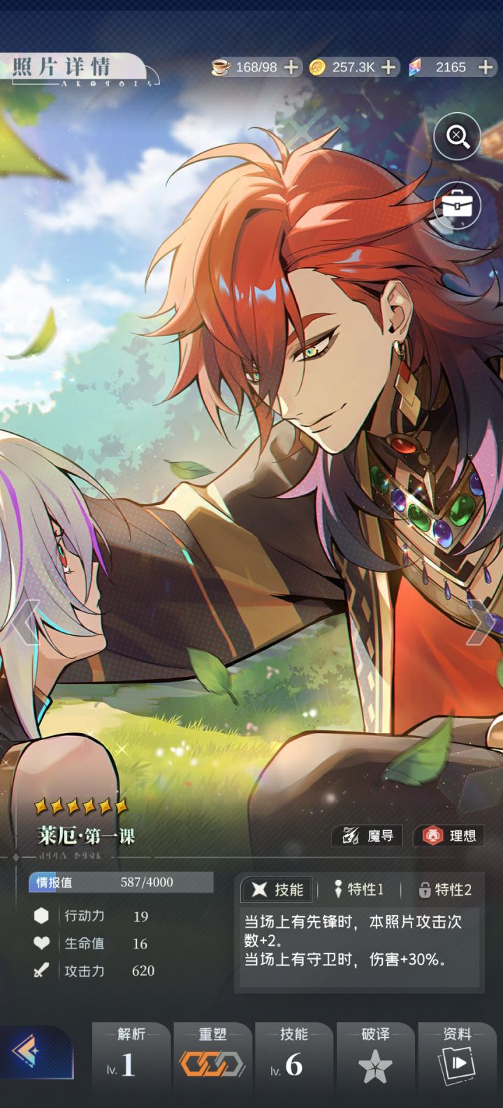 由于前期心锁只开了主角一个的,所以我们最好保证上场的队伍中有至少四张属性为理想的照片。而在这个心锁的影响下,新手期我们的主要养成目标就显而易见是利奥尔的隐秘视线了。开局送的五星照片,属性也是相当不错。利奥尔-隐秘视线 LV30数值如下行动力:11生命值:5攻击力:142技能:攻击2次,每次攻击时获得4点格挡值。特性:1.使用的上一张照片和本照片信念颜色相同(理想)时触发效果,伤害+5