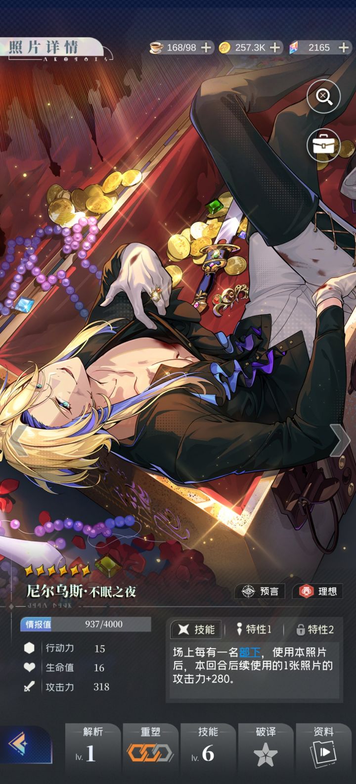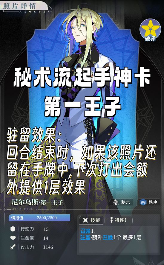 今天在研究照片除了信念以外的第二属性时,发现了一件十分有趣的事情:开服卡池中有两人是只有一张六星卡的——王子尼尔乌斯与侦探欧墨尼。欧墨尼的五星卡第二属性各不相同,而尼尔乌斯的四张五星卡,有三张与六星卡相同,都是秘术属性。这就引发了我的好奇心,究竟秘术是个什么样有特点的属性,几乎能够成为尼尔乌斯的代名词?首先我们来看一下秘术的官方解释,“拥有特殊能力的卡片”。这句解释其实挺暧昧的,和其他“造成多