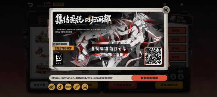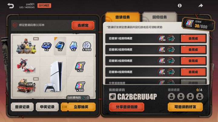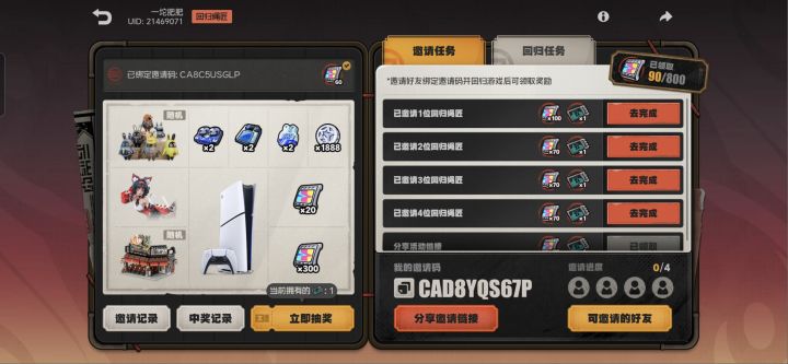 我的邀请码:CA2BCRUU4P邀请好友绑定邀请码并回归《绝区零》最高可获得740菲林!参与抽奖,更有游戏机、手办、周边、菲林等你领取。https://mhyurl.cn/d5D22NdJT?s_c=CA2BCRUU4P