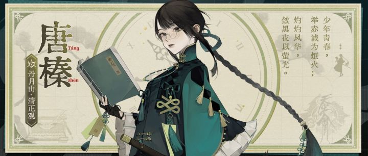 「少年青春,举赤诚为炬火;灼灼风华,敛黑夜以萤光。」唐榛就读于国立江阳大学,现为历史系三年级学生。她是老师们信任的社团活动组织人,也是学生们心目中勤奋又热心的干练学姐。在校外,她还有另一层身份,即为丹月山清正观观主骆园的亲传弟子,正在其师父所经营的法器店“玄霄斋”勤工俭学。虽在灵爻法术方面稍显驽钝,她的一手斩鬼刀却使得出神入化,鬼神闻风而丧胆。如今,她将为清正观扬名作为本分,正为此而不懈努