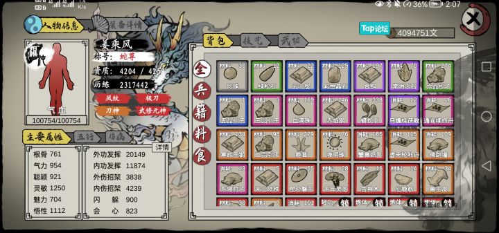 游戏挺好的虽然有些内容还有点bug,比如武功精炼之后的图标会跟背包里的东西图标重叠。但是他们说作者只有一个人,这已经表现的很好了。毕竟人家不仅懂还做出来了,比我(不懂不会做不看攻略都不一定玩的来的人强了不知道多少倍)。游戏是个好游戏,也祝作者越搞越好。接着说一下游戏感受。游戏整体来说还是很好的虽然有一些小的BUG一些功能没有开发,以及游戏里的事件比较少。但是这些影响不大。我个人感受(不代表全部人)