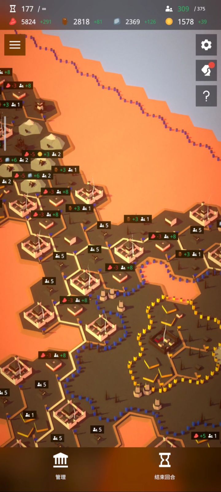 再说些心得吧 1,事物的发展过程不是一帆风顺的,这几天我总是追求“最高效率”但实际上这种完美主义大大降低了游戏体验,而且不断重开的过程中过关时间实际上被拖长了 2,开局发展以粮食为主,木头为辅,石头2-3个转着就可以了,在20回合以前开始挖金,然后注意开石矿,30-40回合金币就完全可以碾压其他文明(供参考) 3,注意!投石机可以将敌人设施直接砸没,包括 敌人的首都 !(没有首都直接灭国)投石车最远距离为六格,打任何设施都是4个投石车就够了