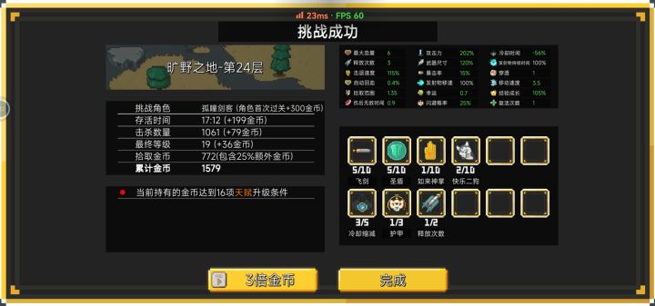 不要怂就是正面刚!主飞剑点出万剑归宗配合减cd加攻击次数再来点回血,副地震波击退防身。 被动我选的拾取攻击力暴击复活释放次数,减cd血量移速可拿可不拿 一秒二三十发飞剑,配合回血和剑客被动还能刷一点攻击力。 地震波次数不多的时候走走位 成型了就站撸