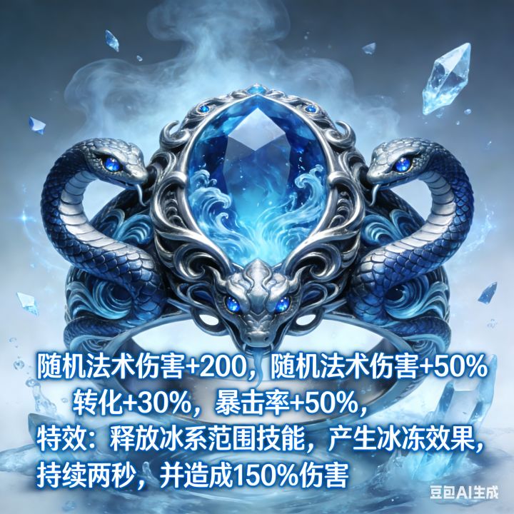 装备建议——秘境200层奖励随机一件史诗套装部位-【八部鬼灭修罗】【帝释天焚手】-手套-随机法术伤害+200,随机法术伤害提高50%,转化+30%。物理伤害+100%特效:释放火系技能,产生连锁爆炸,对范围5×5内的目标造成等量伤害。【龙威娜迦戒】-随机法术伤害+200,随机法术伤害+50%,转化+30%,暴击率+50%特效:释放冰系范围技能,产生冰冻效果,持续两秒,并造成