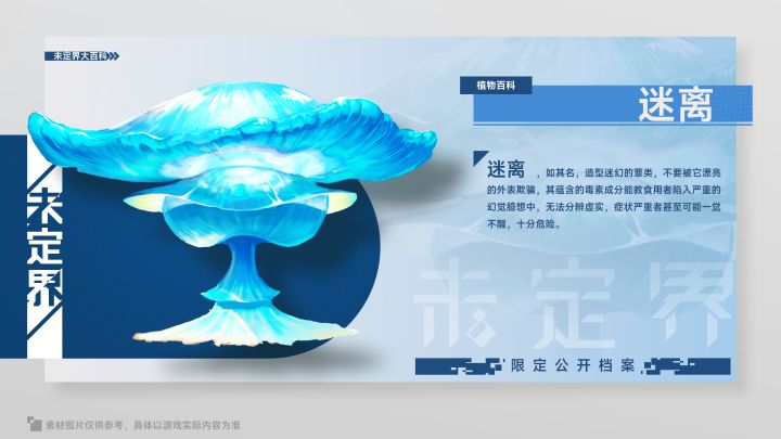 【形态特征】外观近似爆炸云的蕈类,呈妖冶的蓝色,顶部会释放特殊气流诱人食用,口感水润柔嫩,但也蕴含令食用者致幻的成分,因而十分危险。【分布范围】目前仅发现生长于特定区域,似乎与成因相关。【冒险轶事】虽然迷离有相当强的致幻效果,一般不推荐食用,但你在冒险时看到了也可以采集几颗带在身上。有些野生生物非常惧怕它,也许是勾起了什么不好的回忆吧……另外,如果你看见有野生生物正在进食迷离的话,一定