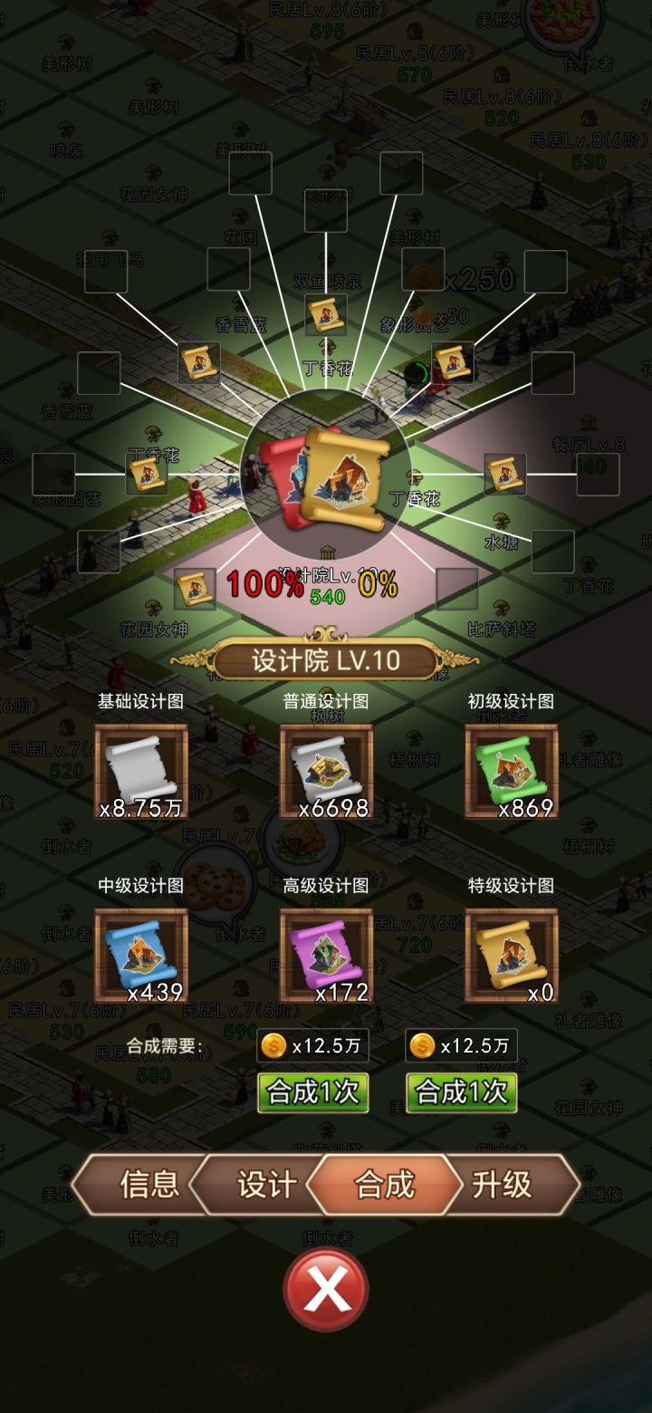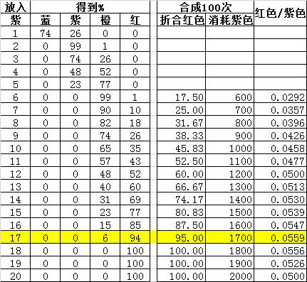 大师图纸(红色)是民居扩建7阶的必需道具,可以用中级(蓝色)、高级(紫色)、特级(橙色)图纸合成。20个蓝色图纸放满也只有12%的几率得到红色图纸,主要还是橙色图纸,还得再合成一次,有点费事。20个紫色图纸可以100%合成红色图纸,但并不一定是最划算的。实际上17个紫色图纸合成最划算。首先,6个橙色图纸100%合成1个红色图纸。多放了没用,不要浪费。看一看表格,1-20个紫色图纸分别能得到什么