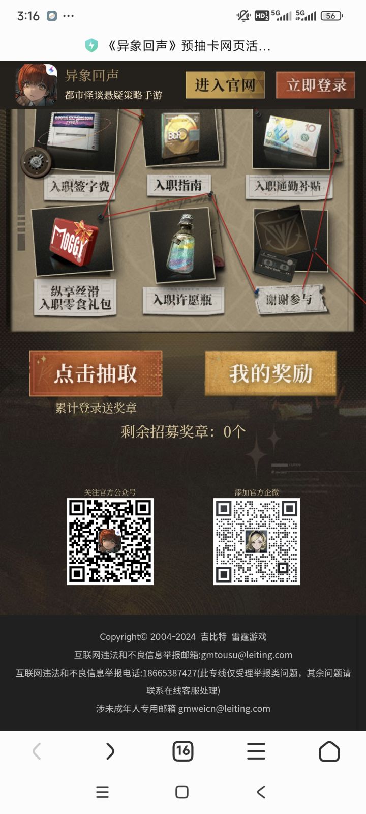 《异象回声》「BCR内网:科长入职系统」预抽卡网页活动已开启!现登陆入职系统领取五星探员,更有神秘入职礼等你抽取!活动时间11月6日至12月6日,点击链接参与活动!https://actscp01.leiting.com/yxhs/act/202410/visioncard/?id=M491113&share_code=c8f9eb5776877d6967228c5720b1c5c8#异象回声