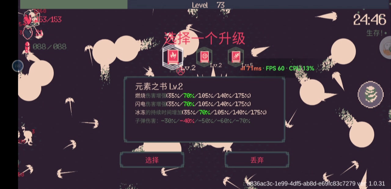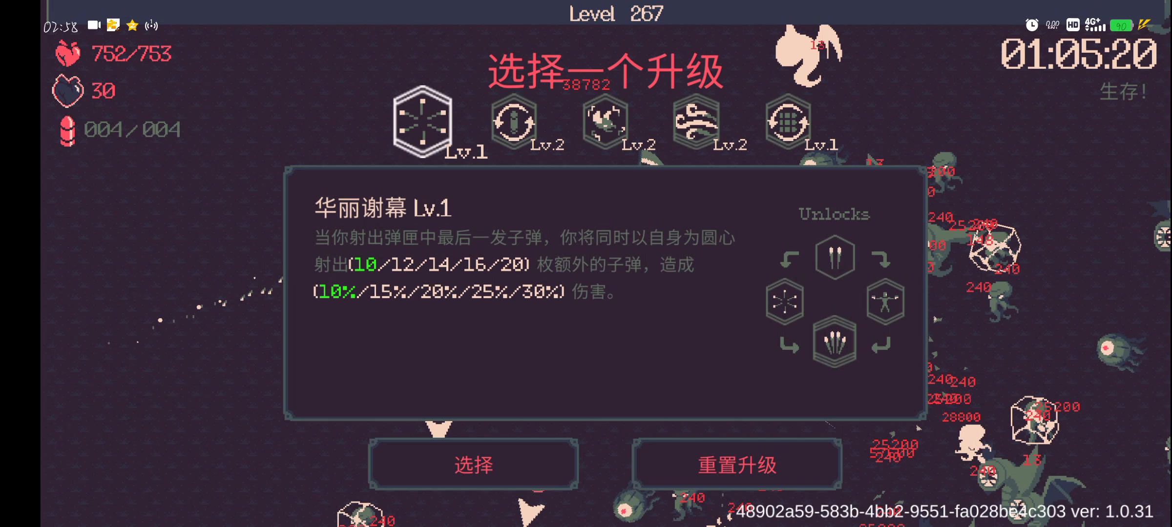 刚才8分钟的时候就卡死了,原因不明,不过最近几次卡死都有一个特点,就是被打中后吃到经验升级,会直接卡死。之前25分钟左右是boss潮,我一直以为是因为我被打出结界所以导致的系统错误卡死,但是现在看来并不是。