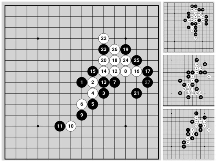 四角阵:黑方四子呈四方形的摆布,因而得名。此阵多由明星、恒星、流星、金星、瑞星等开局演变而来。见图四。四角阵的特点是容易形成2、3支“剑”(棋语有云:三剑在手无不胜),局势利于向纵深发展。攻防的要点是夺先与反夺先,较少出现做棋的机会。