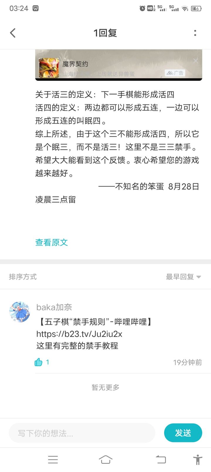 我刚玩一把,我只知道五子棋的大致规则,就是把五个在一起就能赢了,想到这里也有国际赛事的那种禁棋,本来我开始看评论说很简单,我也寻思 ai 应该也会很傻,结果最开始的难度给我整蒙了,必须得耍小心思呀,正大光明的打,要玩一年。希望我可以提高一下技术,别一直输下去😜😜😜😜😜