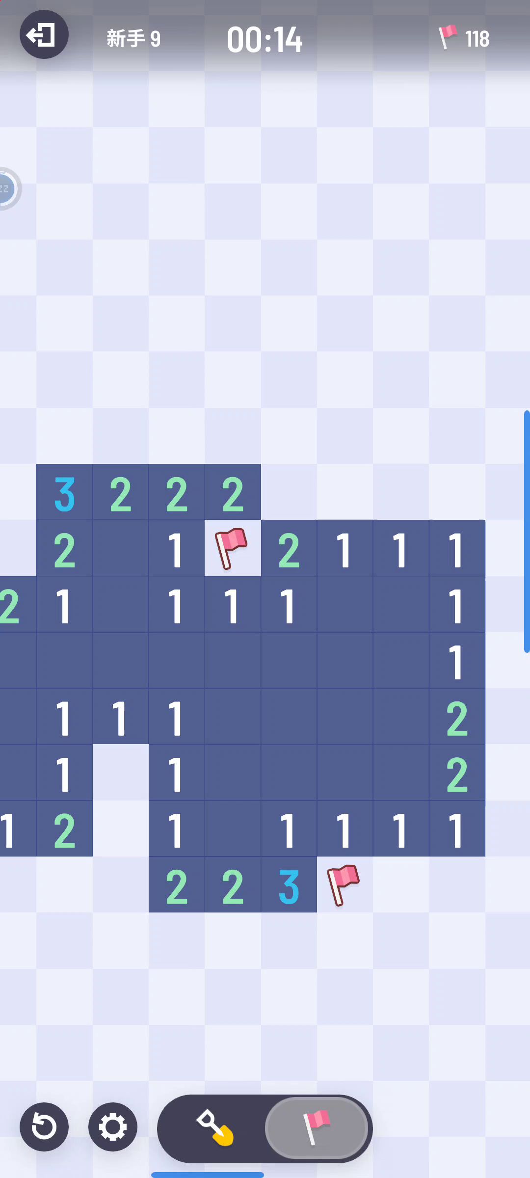 简介:在屏幕底部设置一个临时切换区。扫雷时双手操作,当一只手长按此区域时,另一只手扫雷会使用另一种工具。该区域最好够大,确保盲按不会按错地方。对比长按格子的优势:节省时间,操作更流畅。对比切换按钮的优势:按钮大,只有一个按钮,不易误操作,用起来更踏实。切换工具一般是临时操作,用切换按钮就必须切换两次。缺点:需要双手操作,要单手操作就必须把手机放平面上。附言:只是我不成熟的设想罢