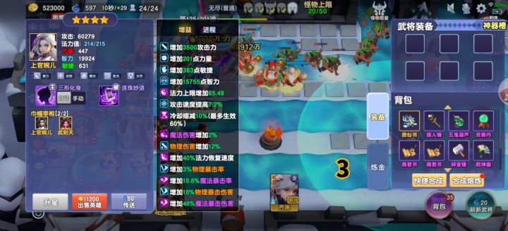 上官属性介绍是形态转换前每秒加五百属性,一看我以为平民玩家崛起了,毕竟百秒五万,再也不会因为合作六七十波无尽一百六七十波以后的断层强度而过不去了。没想是有上限的。极限就是两万。因为没有具体上限介绍,我根据了基础属性,法力上限,两种情况做了三组对比,分别是下纹章,洗魂加的法力上限。区别是法力上限210,纹章齐全多240智力的一组。下纹章少240智力的一组。洗了魂加的法力上限,法力上限160的一