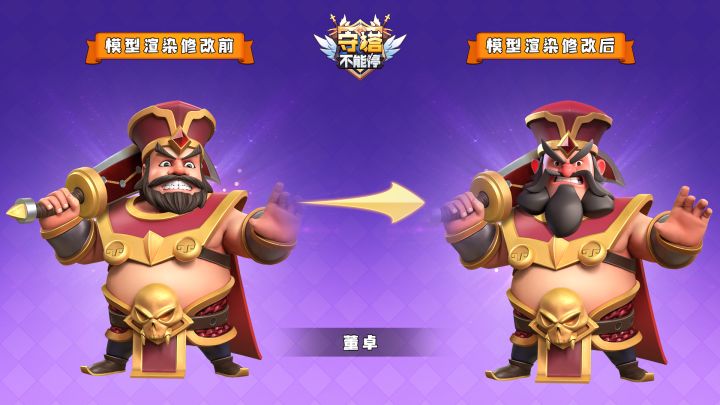 亲爱的召唤师大人们,大家好!《守塔不能停》在后续版本即将迎来一波大的更新。在未来的新版本中,项目组为众多英雄角色进行了重新设计。希望这波形象升级能为大家带来更好的视觉体验。那么都有哪些变化呢?就让我们一起来先睹为快吧!紫将:本次董卓的模型升级主要体现在面部塑造以及身体比例。了解三国的玩家应该知道,董卓体型虽胖,但年轻时却是一个很壮硕、很高的一位猛将。旧版形象中由于头部较大,体现的比例好