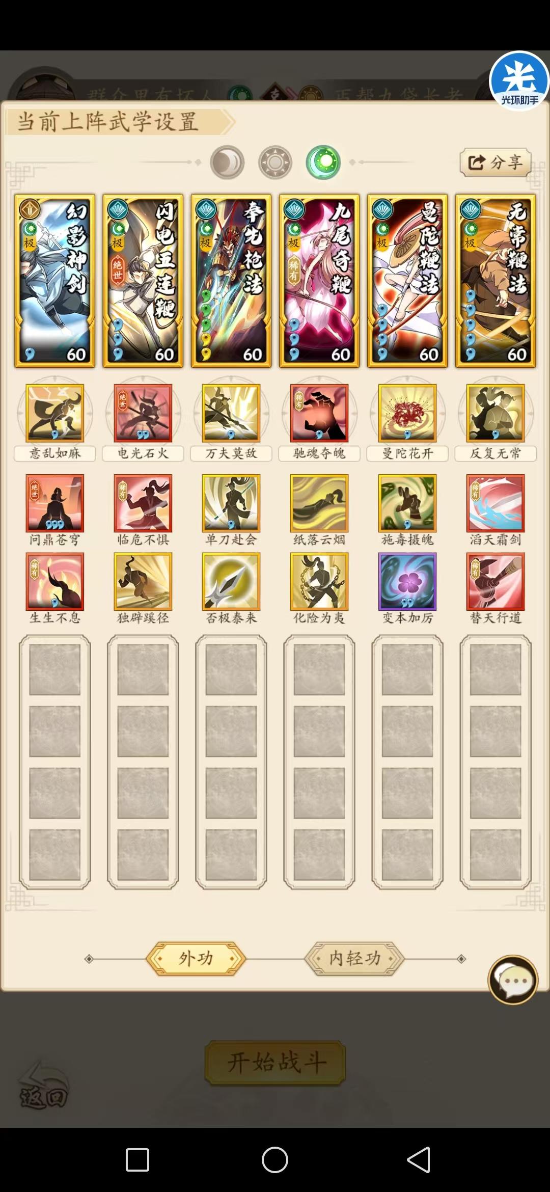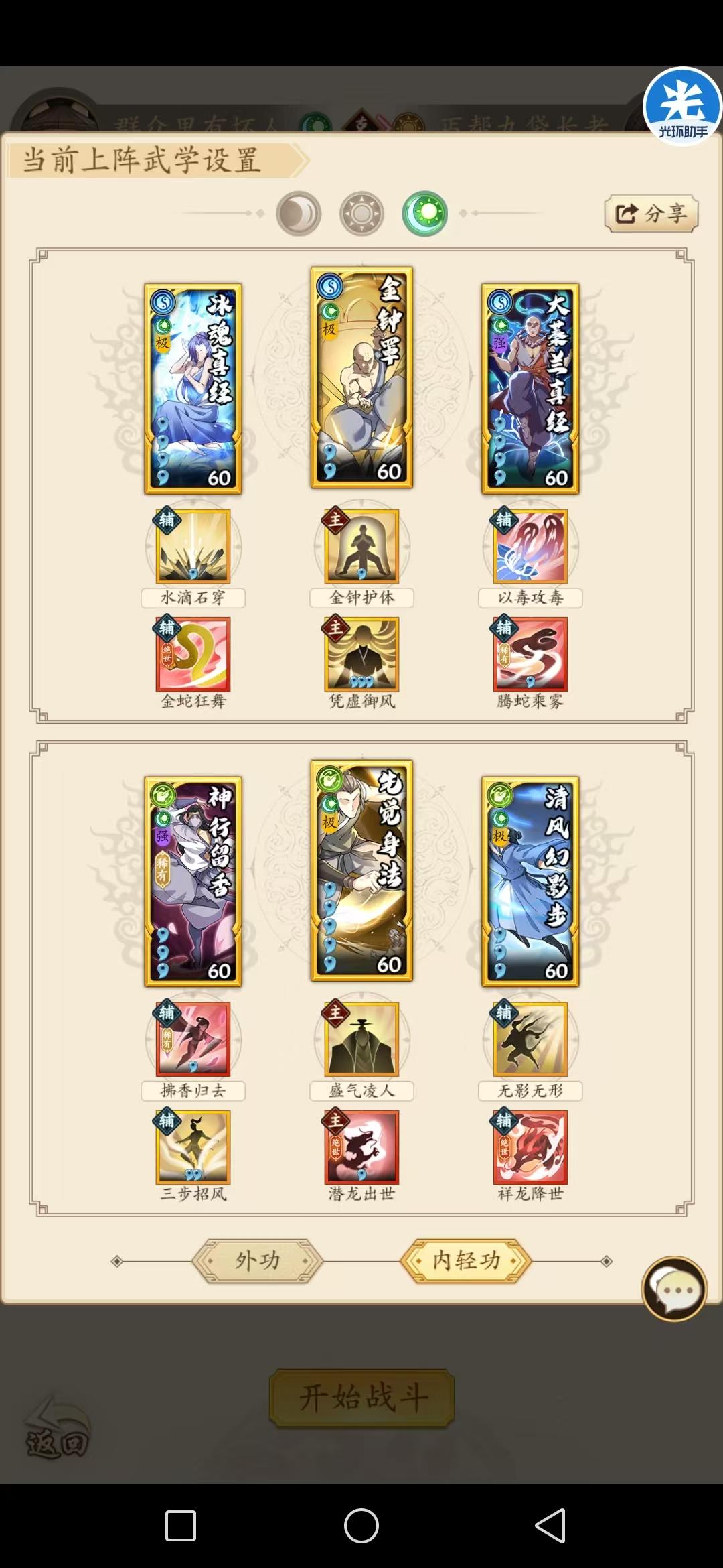好久没有更新攻略啦,最近刚结束素雪,也是把无羁自得给拿到手了。好了话不多说。图一:是我平时普通华山的套路,如果打武林大会,把三步换成如鱼会好一点(因为我们区已经没人在玩吸内了)。带上了兰集蜂萃,刚好配合后面三回血。实战视频请看我后面的帖子。图二:直伤波动拳(打酱油,一般对手都把自己主套路放第一位,只要赢后面两场就好了,上阳直主要是拳系武学歪得挺多。),这个没啥说的,因为我挺多招式没